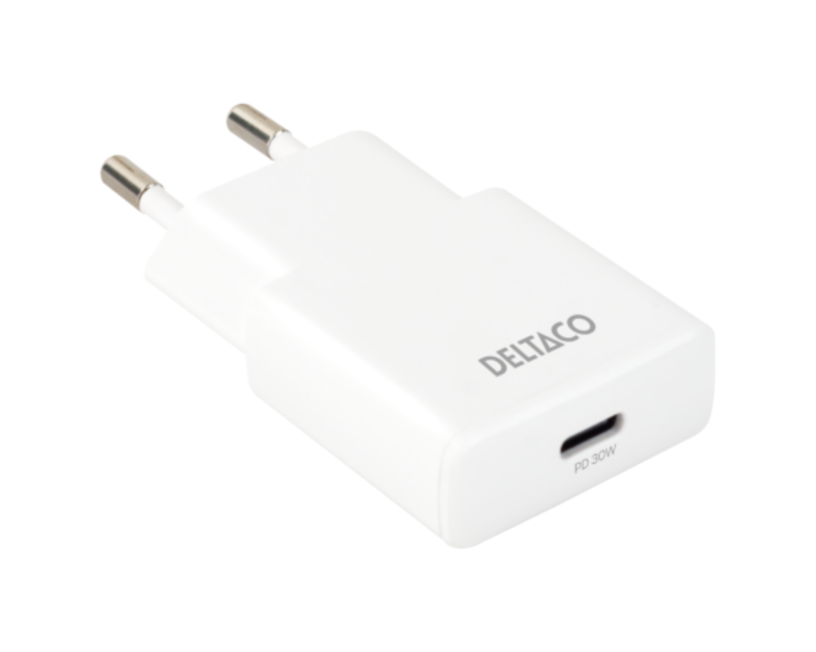 30W USB-C vegglader er en slank vegglader fra Deltaco. Den har en USB-C PD-port med en maksimal effekt på 30 W og støtte for PPS-lading, noe som gjør at den kan tilpasse strøm og spenning for å muliggjøre mer effektiv lading av kompatible enheter. Den slanke designen gjør den ideell for reiser, og dens effektivitet gjør den egnet for smarttelefoner, nettbrett og mindre bærbare datamaskiner.USB-C veggladeren kombinerer Power Delivery-teknologi med PPS (Programmable Power Supply), noe som betyr at den kontinuerlig oppdaterer ladestatusen og justerer strøm og spenning. Den har flere utgangsnivåer: 5 V / 3 A, 9 V / 3 A, 12 V / 2.5 A, 15 V / 2 A og 20 V / 1.5 A, noe som gir høy fleksibilitet for å lade forskjellige typer enheter. Når den brukes i 110 V-uttak er den maksimale effekten 20 W. Enheten er utviklet for å minimere varmeutvikling under lading, noe som bidrar til å forlenge levetiden til batteriet på de enhetene som lades.
