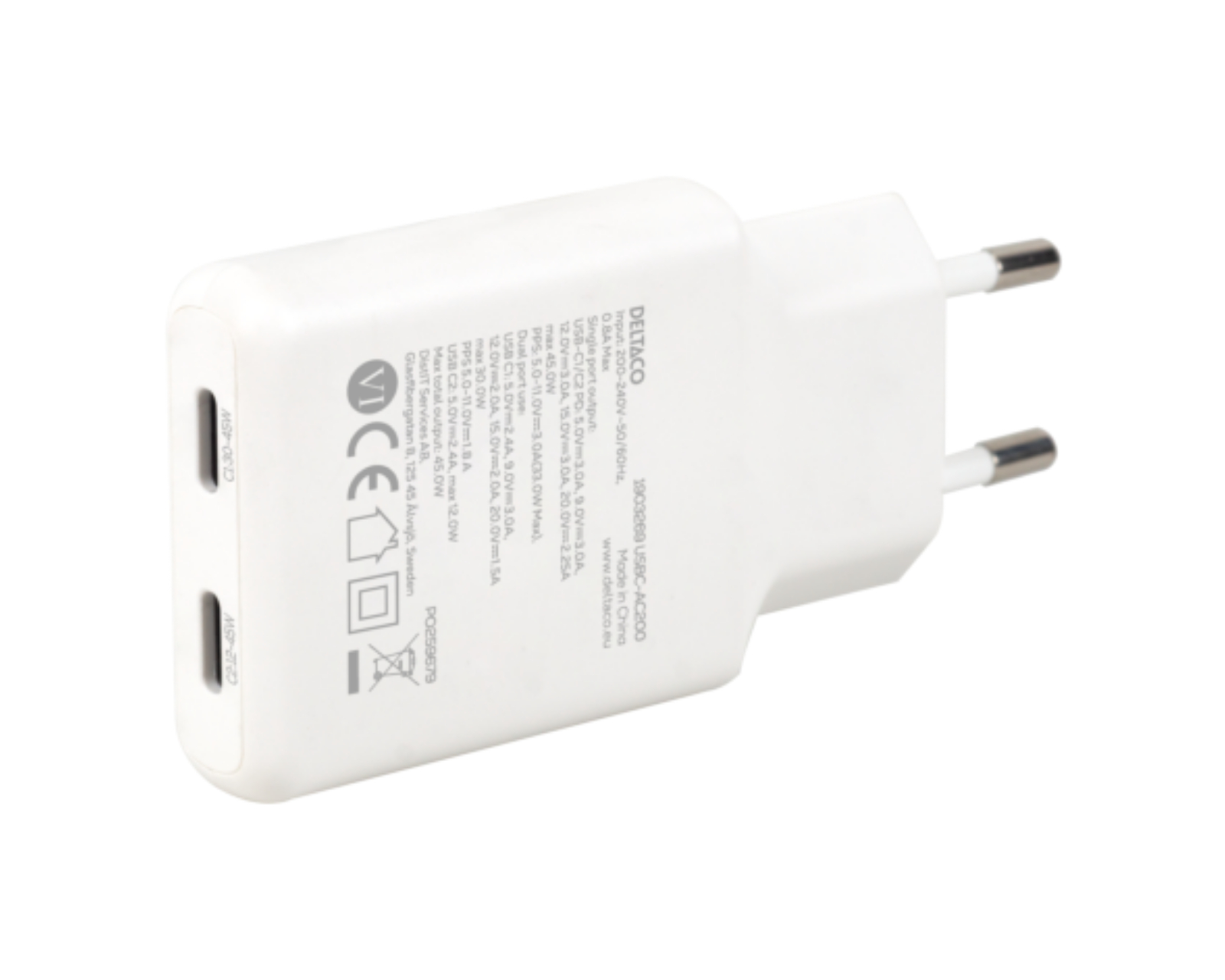 45W 2x USB-C vegglader er en slank enhet fra Deltaco som tilbyr rask og effektiv lading for flere enheter. Den har to USB-C porter og en total effekt på 45 W, noe som gjør den egnet for smarttelefoner, nettbrett og mindre bærbare datamaskiner. Med støtte for PPS-lading og Samsung Super Fast Charging på 45 W, gir denne laderen en allsidig løsning for den teknisk bevisste brukeren.Denne laderen er designet med fokus på effektivitet og varmefordeling. Ved å bruke en port kan du lade med maks 45 W, mens bruk av begge portene gir en maks kapasitet på 30 W for C1 og 12 W for C2. Laderen støtter flere spennings- og strømnivåer, inkludert 5 V / 3 A, 9 V / 3 A, opptil 20 V / 2.25 A. Produktspecifikasjonene viser at den er optimalisert for å forlenge enheters batteritid ved å minimere varmeeffekter.