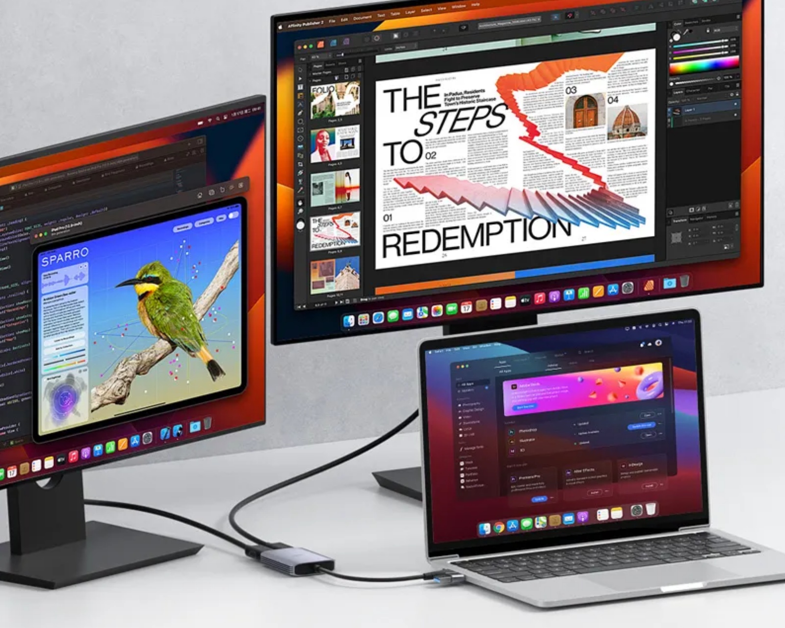 USB3.0 til HDMI-adapter er en adapter fra Hagibis som gjør det mulig å koble til flere eksterne skjermer til Apple-datamaskiner som er utstyrt med M1-, M2- eller M3-brikker. Produktet tilbyr støtte for å øke produktiviteten ved å muliggjøre visning på tre skjermer samtidig, enten i samme visningsmodus eller forskjellige visningsmoduser. Adapterens allsidighet gjør den egnet for ulike bruksområder, spesielt innen multitasking og presentasjonsmiljøer.Adapterens design inkluderer støtte for både USB-C og USB-A grensesnitt, noe som gjør det mulig å enkelt veksle mellom ulike enheter. Den tilbyr en høyoppløst utvidelse med en kapasitet for 1080P/60Hz bildekvalitet, som sikrer at farger gjengis korrekt og at lyd og video synkroniseres. I tillegg er adapterens konstrukjson med et hult aluminiumshylster og varmeavledende finner effektiv for varmehåndtering. Enheten er også kompakt og lett, noe som letter transport.