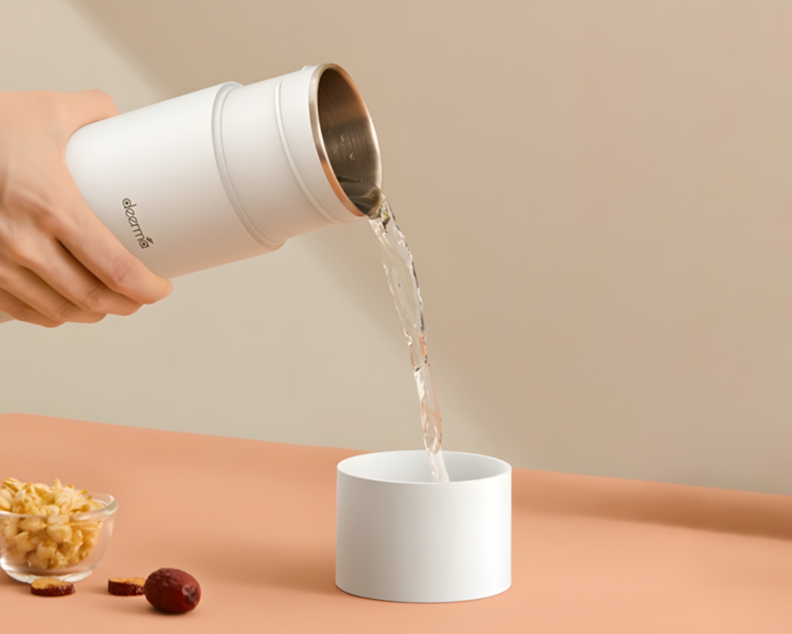 En praktisk vannkoker fra Deerma som tilbyr både koking og termofunksjon i en kompakt enhet. Den har en kapasitet på 350 ml og er laget av holdbart 304 rustfritt stål, noe som garanterer langvarig bruk. Produktet er designet for å være lett og bærbar, noe som gjør det ideelt for bruk hjemme, på kontoret eller under reiser.Enheten er utstyrt med tre lag av termoisolasjon, noe som gjør at det varme innholdet holder temperaturen lenger når den er frakoblet. Den har også et sikkerhetsventilsystem med tre ventiler for å sikre effektiv fordampning og økt sikkerhet. Den enkel-knappsteknologien gjør den brukervennlig, og den sklisikre silikonplaten sørger for stabilitet ved bruk. Leitene er avtagbare for enklere transport og lagring.