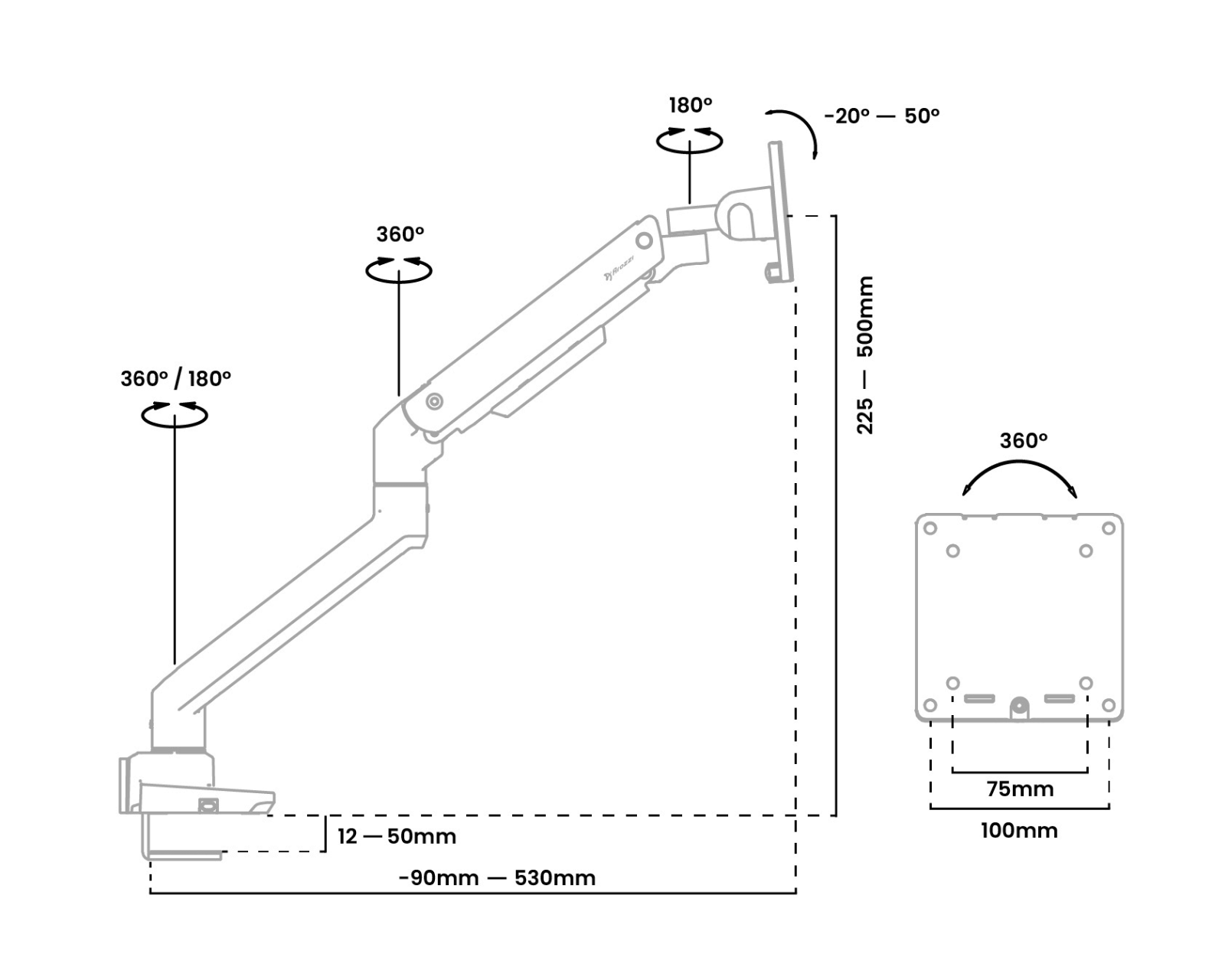 - Helling: +50° til -20°, Svingområde: +90° til -90°