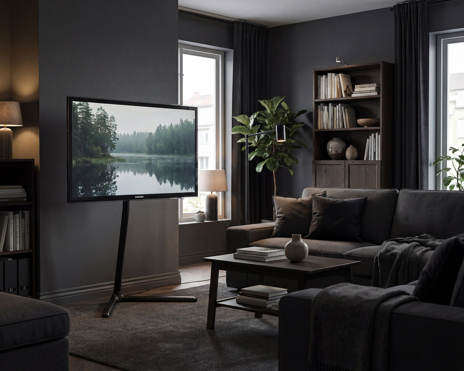Svingbart TV-stativ 32"-70" er et TV-gulvstativ fra MaxMount som tilbyr en fleksibel og stabil løsning for TV-er med skjermstørrelser mellom 32 og 70 tommer. Med fire høydeinnstillinger kan brukeren enkelt justere stativet for å oppnå den mest komfortable visningshøyden. Den svingbare funksjonen gir mulighet for å tilpasse visningsvinkelen, noe som er ideelt for rom med flere sitteplasser.Stativet er konstruert med høy holdbarhet og funksjonalitet i tankene. Det er utstyrt med et snap-lock-system for rask og sikker TV-montering, samt en V-base for ekstra stabilitet. Den innebygde kabelhåndteringen holder kabler organisert og fri for sammenfiltring, noe som bidrar til et ryddig utseende. Takket være justerbare føtter er stativet også stabilt på ujevne overflater. Inkludert sikkerhetssett gir de nødvendige komponentene for å minimere risikoene for utilsiktet tippe, noe som er avgjørende for en sikker bruk.