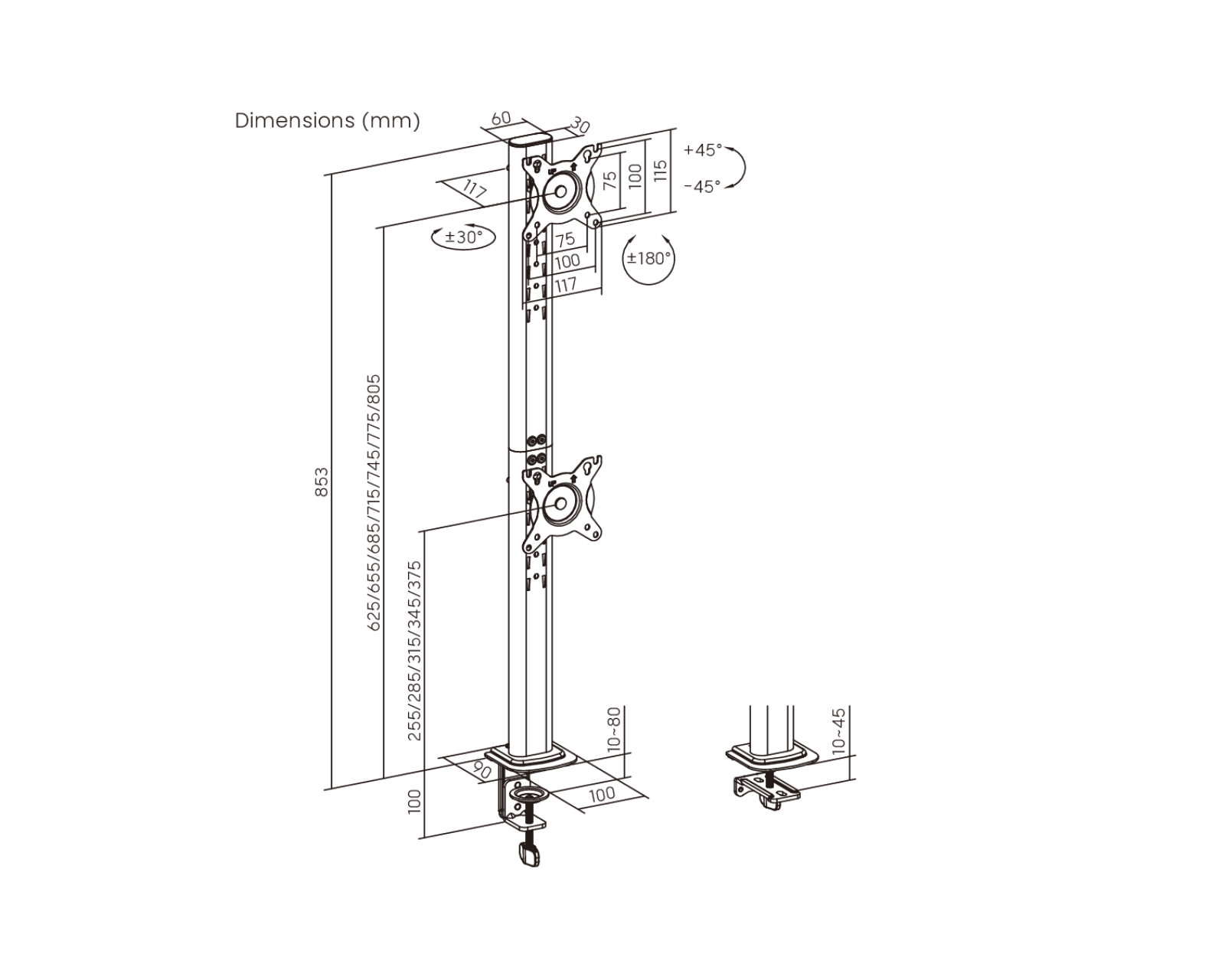 MaxMount Vertikalt Bordfeste for 2 skjermer 17"-34" 12 kg er en robust løsning fra MaxMount, designet for gamere og profesjonelle brukere som trenger optimal skjermflate. Dette bordfestet muliggjør plassering av to skjermer på en vertikal måte, noe som gir en ergonomisk arbeidsflate og frigjør verdifullt skrivebordsplass. Stativet støtter skjermer med en maksimal vekt på 12 kg og har VESA-fester for både 75x75 mm og 100x100 mm.Det vertikale stativet er laget av holdbart stål og tilbyr omfattende justeringsmuligheter, inkludert helling opp til +45°/-45°, svingområde på +30°/-30° og 360° rotasjon for enkelt å veksle mellom landskaps- og portrettmodus. Med verktøyfri installasjon kreves det ingen ekstra tilbehør, noe som gjør det enklere å finne den perfekte posisjonen for hver skjerm. Kabelhåndteringen holdes i orden med medfølgende kabelklips, noe som bidrar til en ren og profesjonell oppsett. Takket være den kompakte emballasjestørrelsen er dette også et mer miljøvennlig valg for nettkunder.