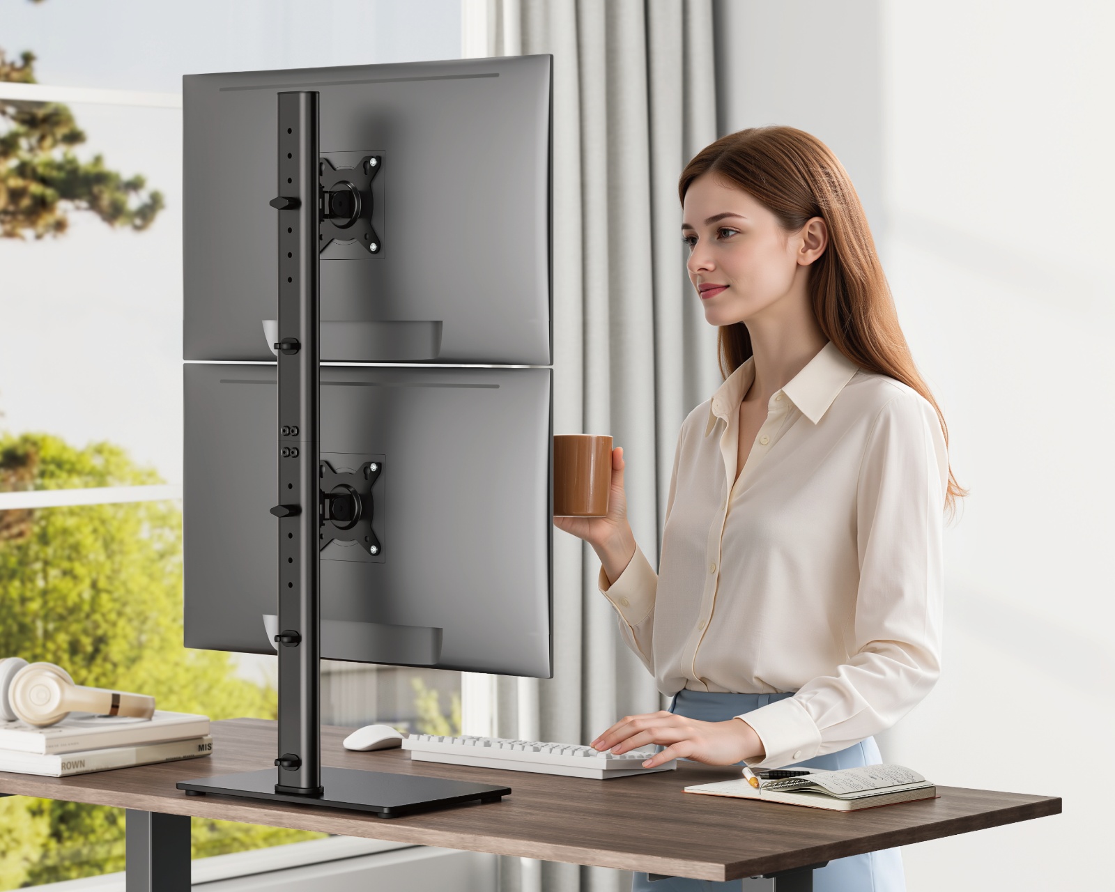 Vertikalt Skjermstativ for 2 skjermer 17"-34" 12 kg - Svart er et skjermstativ fra MaxMount designet for å støtte to skjermer med en vektkapasitet på opptil 12 kg per skjerm. Dette stativet tilbyr en kompakt og stabil konstruksjon med et stilrent utseende, takket være basen i herdet glass. Stativet har også flere høydejusteringsnivåer som gjør det mulig å tilpasse seg forskjellige arbeidsmiljøer og brukernes preferanser. Takket være det verktøyløse lutningssystemet kan skjermen enkelt justeres mellom +45° til -45°, som gir brukeren en optimal visningsvinkel.Byggekvaliteten hos Vertikalt Skjermstativ er høy, med materialer av plast og stål som gir både holdbarhet og stabilitet. VESA-kompatibiliteten (75x75 og 100x100) gjør det enkelt å feste skjermer, og den 360° roterende platen gir fleksibilitet i bruken. Stativet er designet for både gamere og kontorarbeidere, noe som betyr at det kombinerer funksjonalitet med stil. Kabelhåndteringssystemet sørger for at kabler holdes organiserte, noe som skaper en ren og effektiv arbeidsflate. I tillegg sikres stabiliteten av den store basen, slik at enheten ikke velter uansett hvordan den justeres.