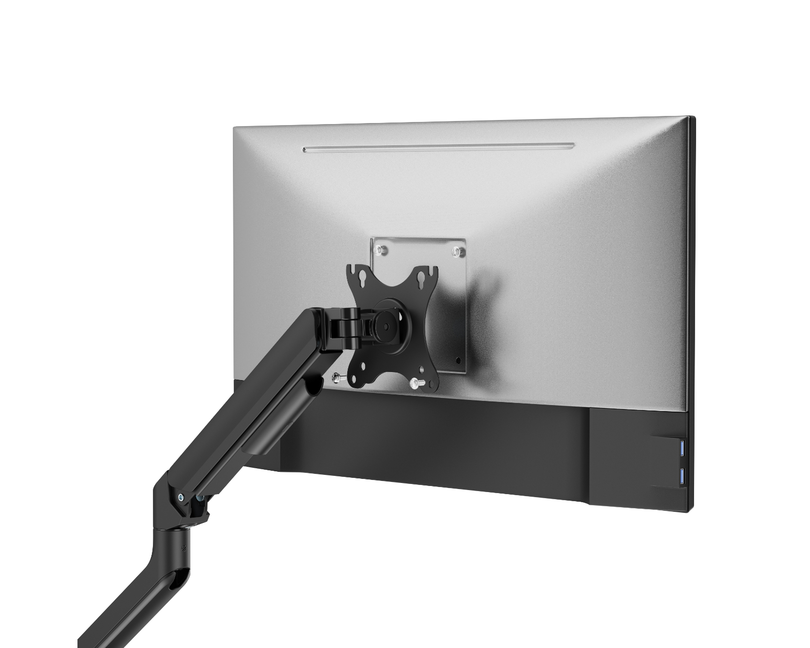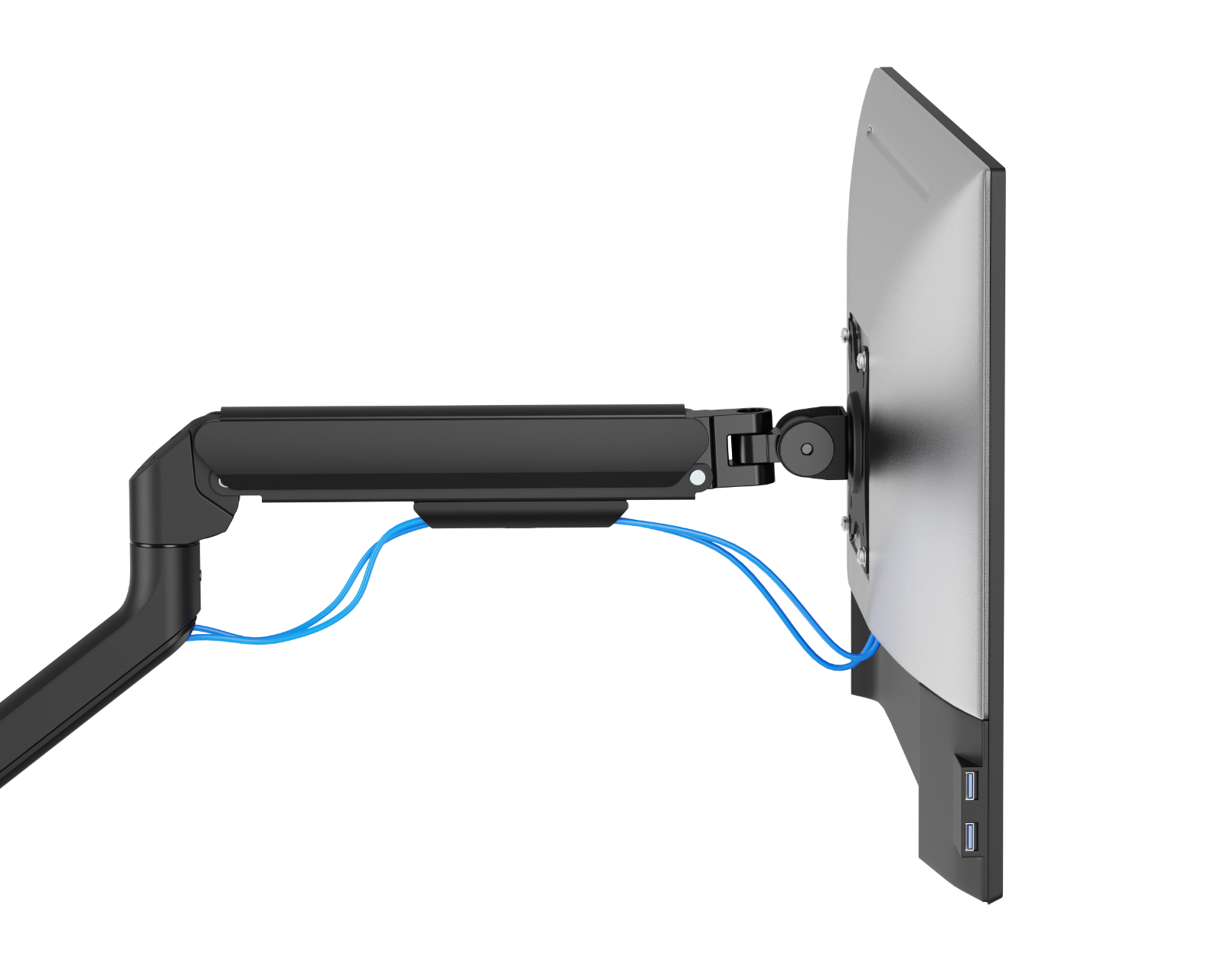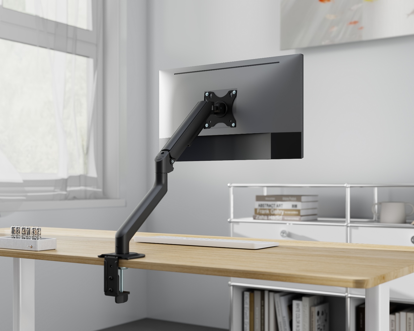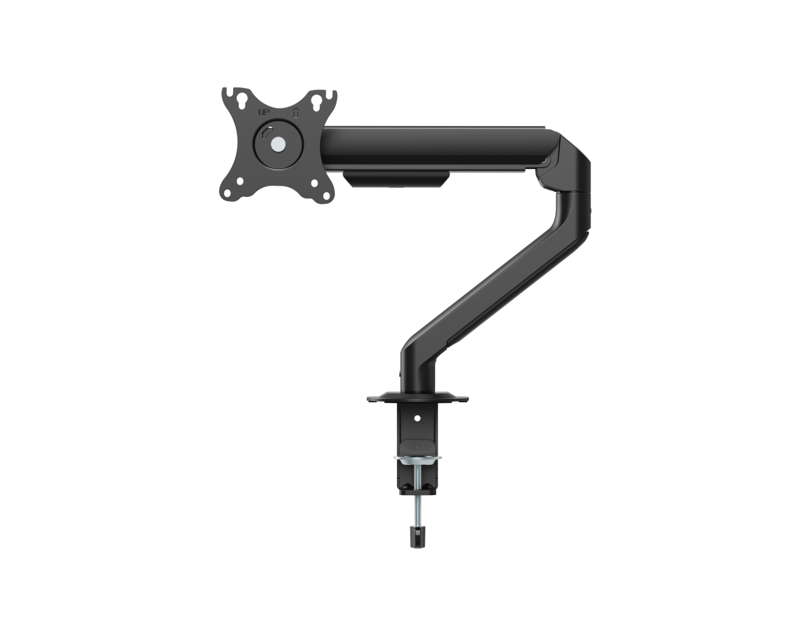 Skjermstativ med mekanisk fjær fra MaxMount som støtter skjermer mellom 17" og 32" med en maksimal vekt på 9 kg. Denne armen tilbyr smidig og enkel justering av skjermen takket være en innebygd fjæring som letter manipuleringen. For å forenkle installasjonen er festeplaten utstyrt med nøkkelhullsmønster og en hurtigkoblingsfunksjon. Monitorarmen er designet for å effektivt håndtere kabler og bidra til en organisert arbeidsflate.Armens konstruksjon muliggjør stor bevegelsesfrihet for skjermen. Den kan vippes, svinges og roteres, noe som gjør det mulig å justere skjermens høyde og vinkel for optimal visning. Denne monitorarmen er tilgjengelig med to monteringsalternativer: både skrivebordsklemme og grommet følger med, noe som gjør at den kan tilpasses ulike skrivebordstyper. I tillegg sikrer det integrerte kabelhåndteringssystemet en ryddig og ren arbeidsflate.
