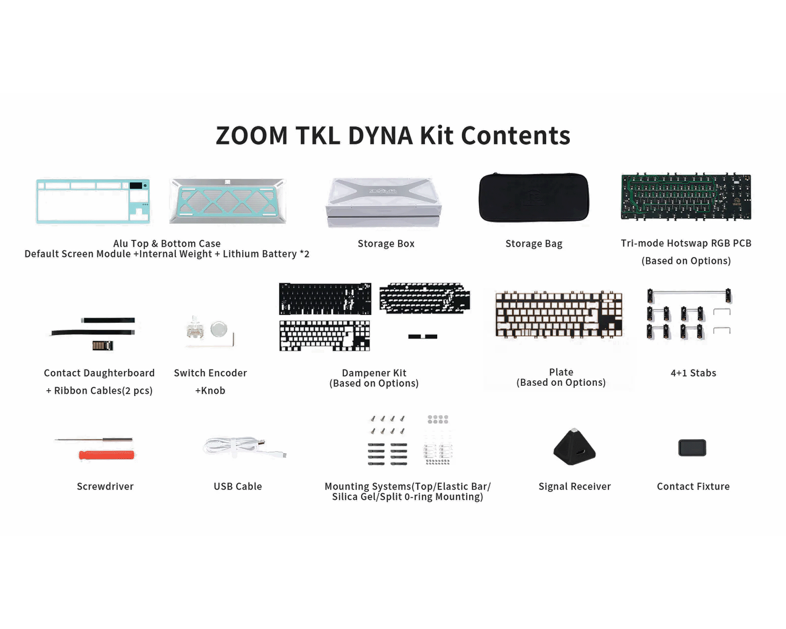 Vær oppmerksom på at tastaturet krever montering, ingen brytere og keycaps er inkludert.ZOOM TKL DYNA er et barebones-kit fra Wuque Studio som tilbyr en variert brukeropplevelse. Den modulære designen gjør det mulig å justere skjermen og kontrollerne, noe som gir brukerne frihet til å tilpasse innstillingene sine. Enheten har et chassis i 6063 aluminium og et skrufritt kulåsningssystem for enkelt å bytte mellom ulike monteringsalternativer. Den har støtte for både kablet tilkobling via USB-C samt trådløs via Bluetooth 5.4 og 2.4 GHz.