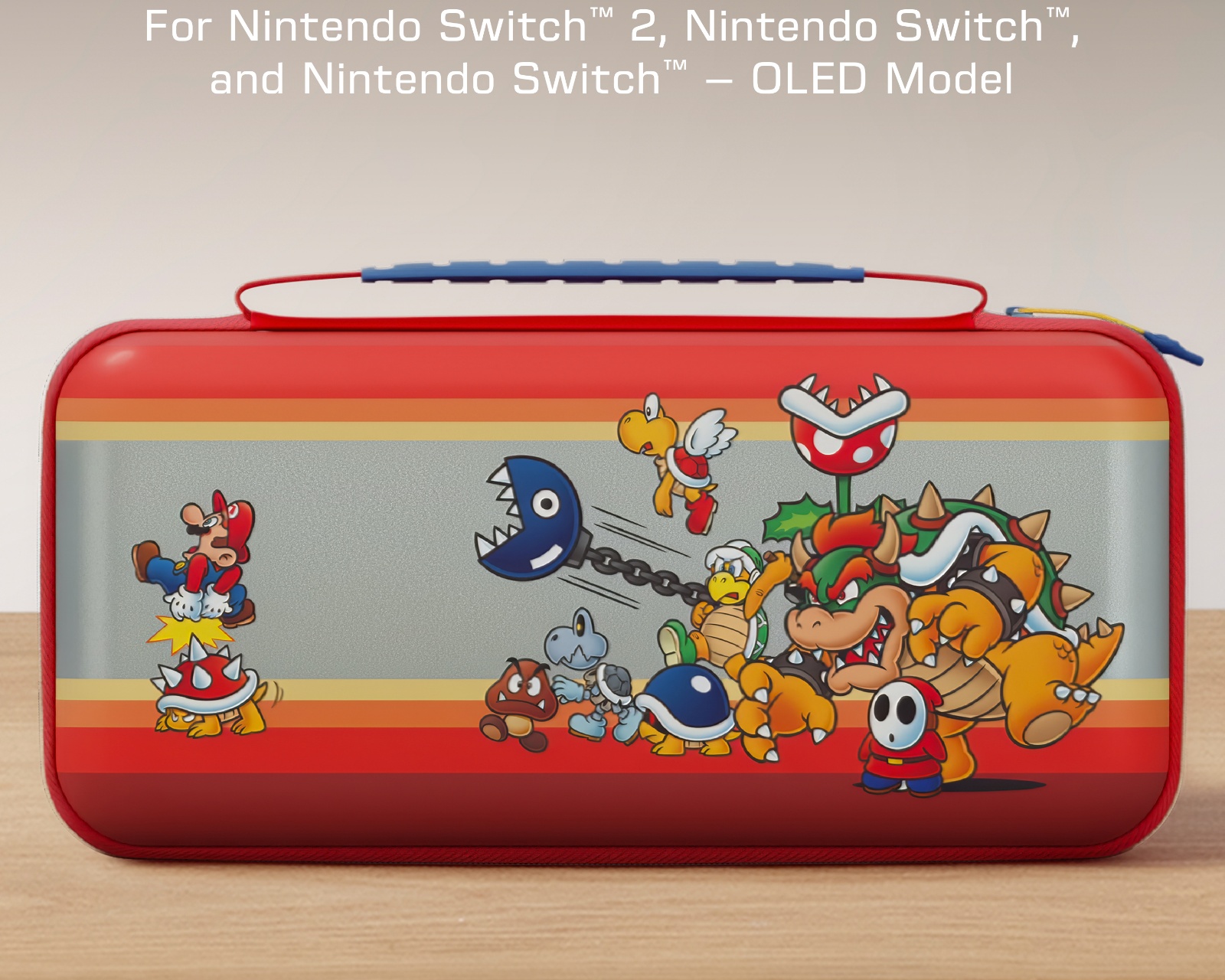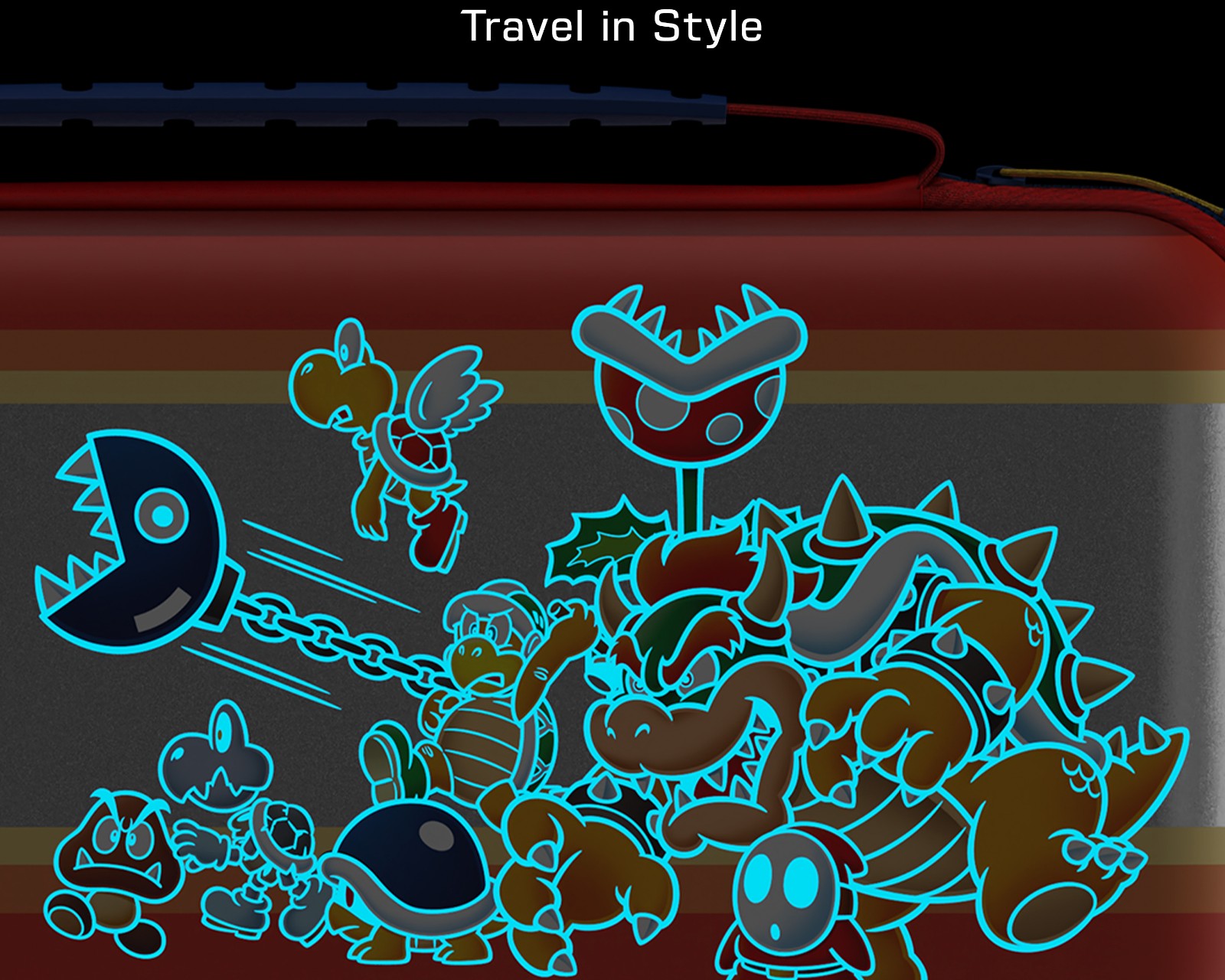 Turtle Beach® PlayTrek™ reiseveske er et bärbart etui fra Turtle Beach designet for å beskytte Nintendo Switch™ 2. Denne vesken kombinerer holdbarhet med funksjonalitet og er designet for å sikkert oppbevare spillkonsollen din. Med en EVA-formet skallstruktur og PU-lädereksteriør tilbyr den et ekstra beskyttende lag, mens den indre polstrede lommen hjelper til med å forhindre riper på skjermen.Interiøret har dedikerte rom for spillkort, noe som gjør det enkelt å transportere favorittspillene dine. Den nettede lommen er perfekt for små tilbehør som kabler eller høretelefoner. Vesken har også en forsterket bärereim som gjør transporten behagelig uansett om du er på vei til en venn eller reiser lengre strekninger. Det unike Koopa Troop-temaet med glow-in-the-dark-design gir et distinkt utseende, spesielt i svakt lys. Den kompakte men romslige designen sikrer at utstyret ditt er beskyttet uten å kompromittere stilen.
