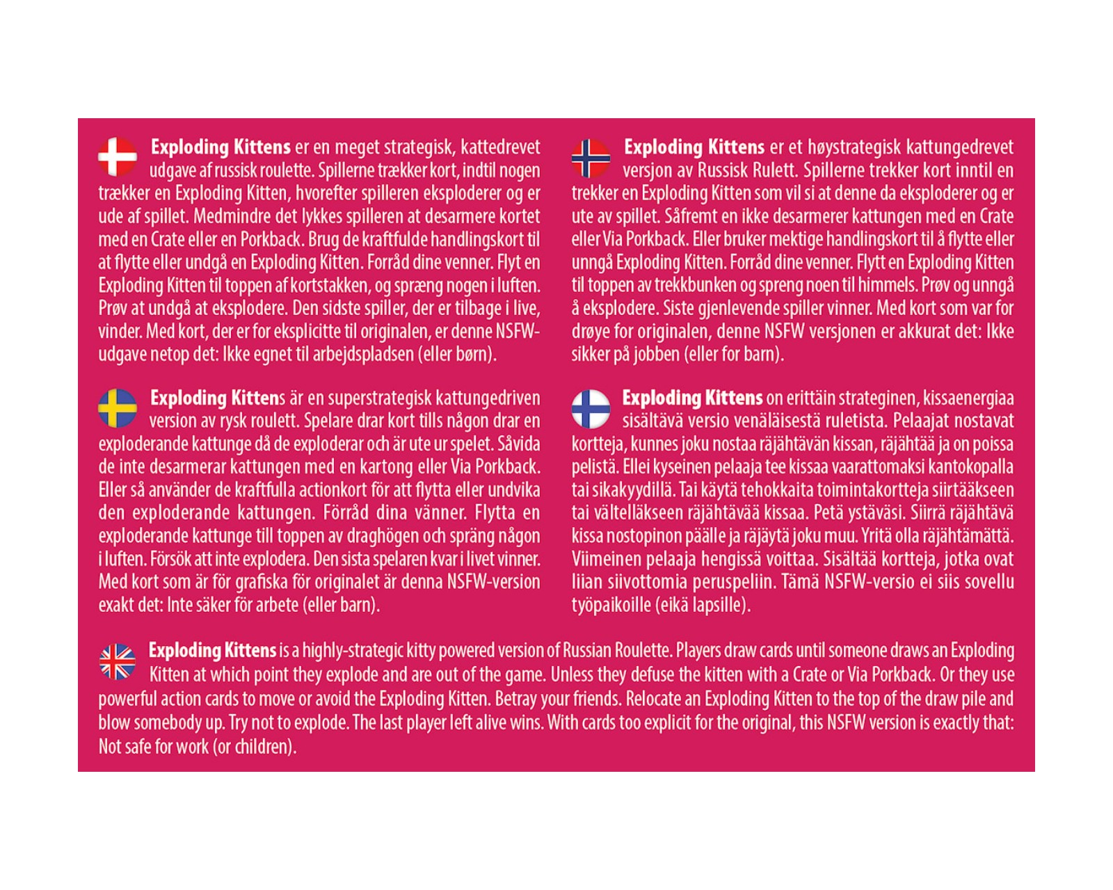 Exploding Kittens (NSFW Edition) er et brettspill som tilbyr en strategisk spillopplevelse i en humoristisk og voksen variant av russisk rulett. Spillere trekker kort med mål om å unngå å trekke den eksploderende kattungen, som eliminerer dem fra spillet. Spillet er designet for 2-5 spillere og har en spilletid på ca. 15 minutter. Alderanbefalingen er 17 år og oppover, på grunn av dets grafiske og voksne innhold.Spillmaterialet inkluderer ulike kort, som kan brukes for å nøytralisere den eksploderende kattungen og sabotere motstanderne. Spillerne kan avverge eksplosjonen ved hjelp av kort som kartonger eller Via Porkback. I tillegg kan kraftige aksjonskort brukes for å påvirke spillets gang. Innholdet er presentert med instruksjoner på svensk, norsk, finsk og dansk for å lette spillingen.