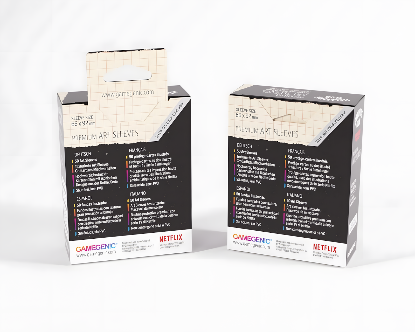 Stranger Things: Hellfire Club Art Sleeves er beskyttende ermer for kortspill, laget av en offisiell lisensiert produsent. Disse ermer tilbyr en behagelig shuffle-følelse og er designet for å passe en rekke ulike kortspill. Hver pakke inneholder 50 ermer. Størrelsen på hver sleeve er 66 x 92 mm og de er laget av polypropylen.Art Sleeves er trykket med ikoniske mønstre fra den populære Netflix-serien og finnes i to unike designalternativer. De er forsynet med en matt bakside og en gjennomsiktig front, noe som gir en estetisk opplevelse uten å kompromisse med beskyttelsen av kortene. Materialet er syrebestandig og inneholder ikke PVC, noe som sikrer at kortene forblir i god stand over tid. Disse ermer er tilpasset standardstørrelse kort og egner seg for både samlere og spillere.