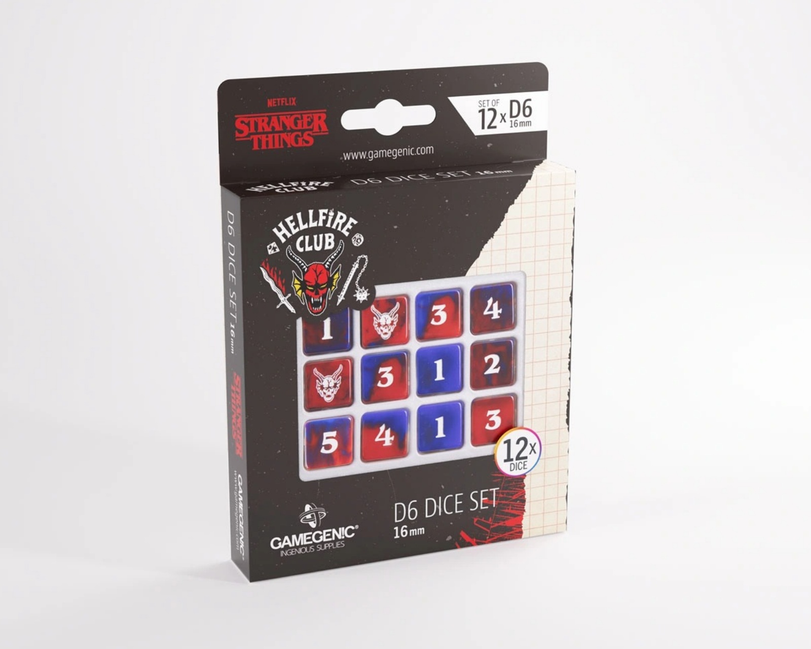 Hellfire Club D6 terningsett 16mm er et sett med 12 høykvalitets terninger fra Stranger Things™. Disse sekskantede terningene er laget av harpiks og er en komponent ment for RPG, brettspill samt bordspill. Terningene har en størrelse på 16 mm og kjennetegnes av jevne, avrundede kanter som gir en smidig følelse ved kast, samt tydelig synlighet av tallene. Produksjonsmaterialet, harpiks, bidrar til en robust og holdbar byggkvalitet.Designet inkluderer en unik funksjon der "Nummer 6" representeres av Hellfire Club-logoen, noe som gir terningene et tema fra serien. Terningene har en tiltalende visuell stil gjennom en kombinasjon av to farger, som skiller dem fra vanlige terningsett. Den planlagte emballasjetypen er en vindusboks i kartong, som gjør det enkelt å vise innholdet.