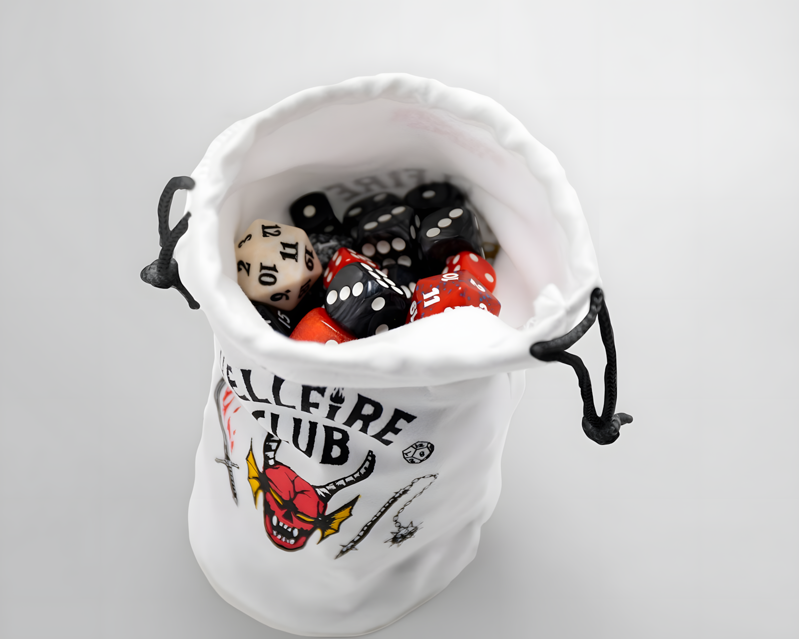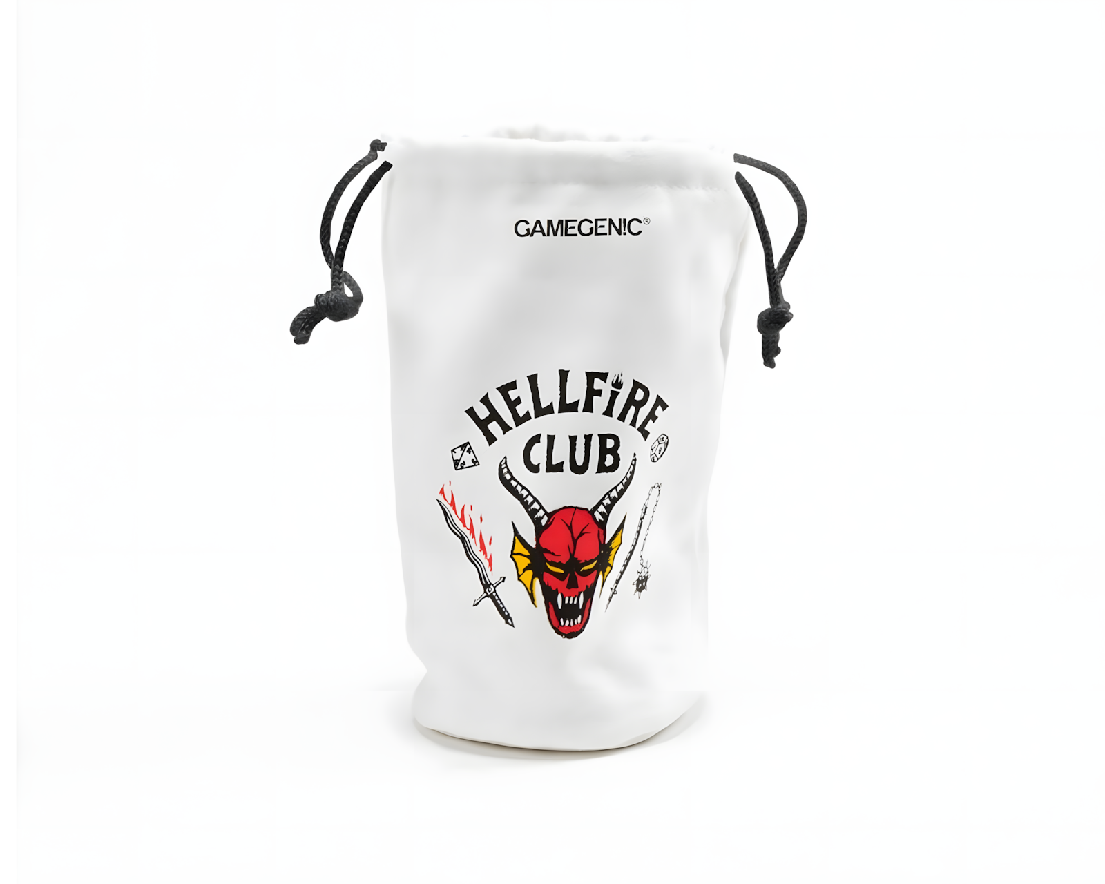 Stranger Things: Hellfire Club er en terningpose fra Gamegenic som tilbyr en myk og luksuriøs følelse med sitt fløyelslignende materiale. Terningposen er designet for å oppbevare og transportere over 130 RPG-terninger, noe som gjør den ideell for bruk i rollespill, brettspill og kortspill. Den har en integrert bunn som holder posen oppreist og lukkes sikkert med snor for å forhindre at terningene faller ut.Terningposen er laget av syntetisk tekstilmateriale og har målene 90 x 170 mm. Den er designet for å være funksjonell og lett tilgjengelig for bruk i ulike spillesituasjoner. Det ikoniske Hellfire Club-motivet fra serien Stranger Things™ gir en interessant visuell aspekt og kobling til populærkulturen. Forpakningen består av en pappeske som beskytter innholdet.