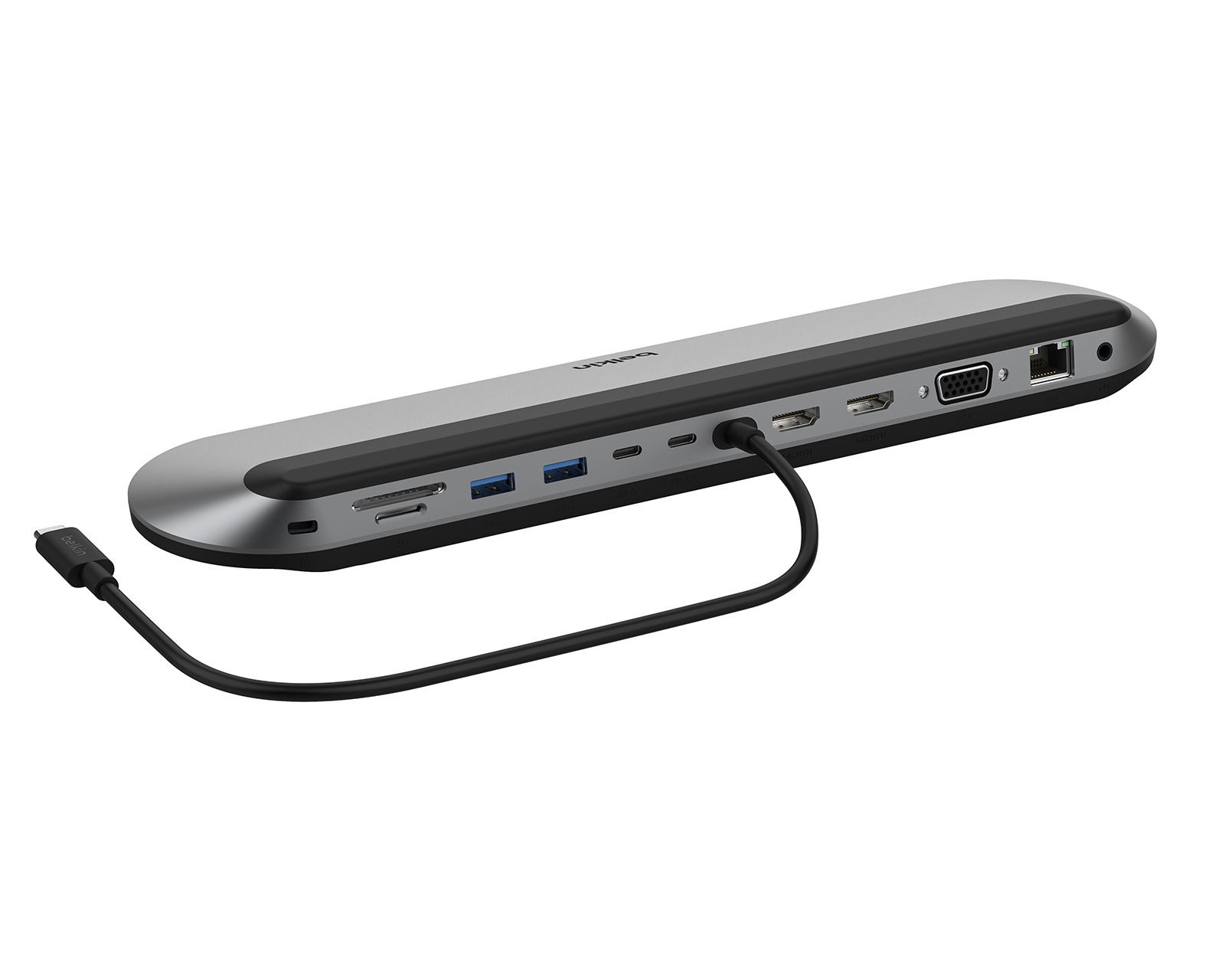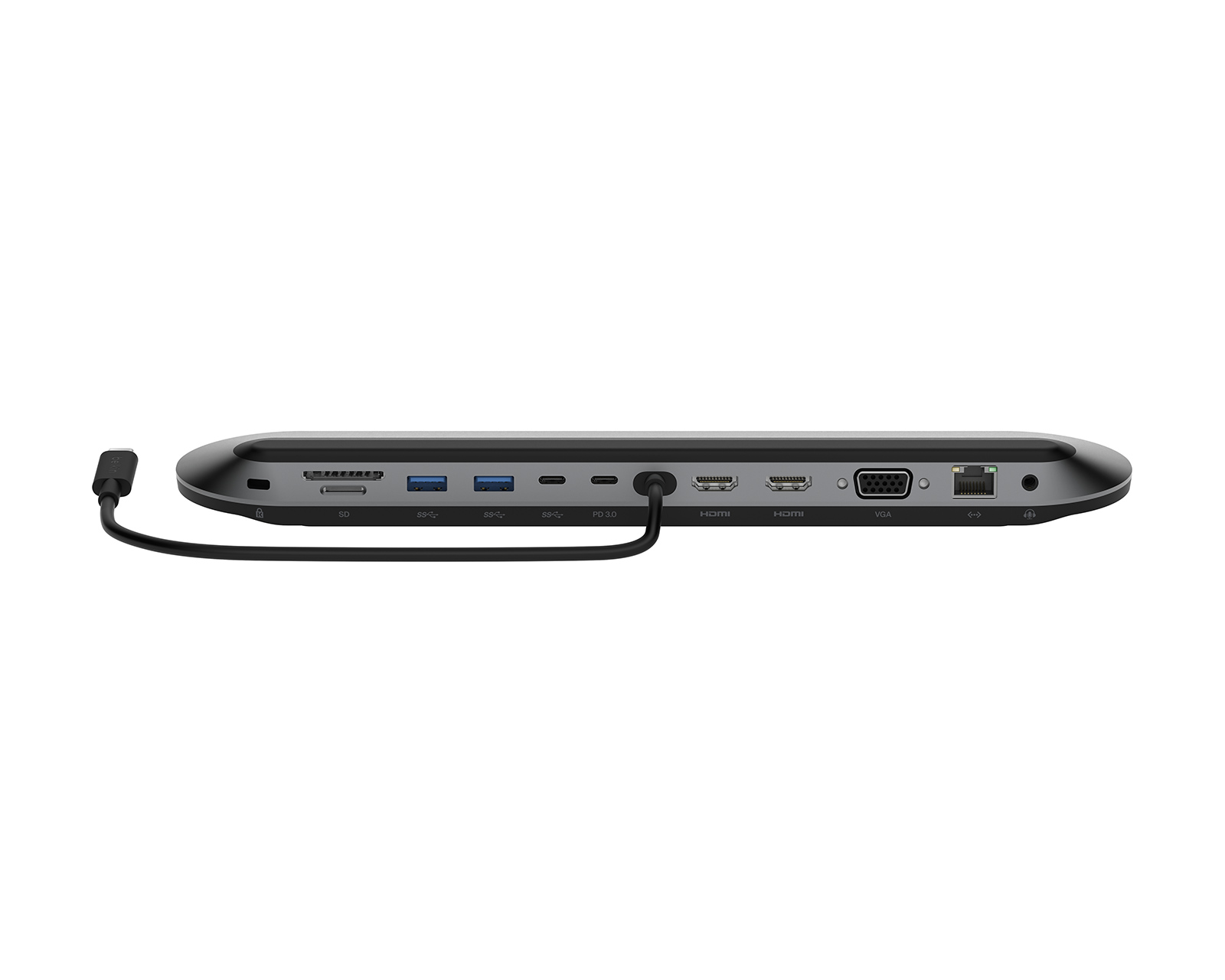 Den tilbyr én USB-C PD for hurtiglading, én USB-C for dataoverføring og to USB-A for tilkobling av diverse tilbehør. To HDMI-porter (én HDMI 2.0 for HD-video og én HDMI 1.4 for Standard Definition). Én Gigabit Ethernet-port for stabil internettforbindelse og én VGA-port for eldre skjermer. Én SD-kortspor og én MicroSD-kortspor for minnekort, samt en 3,5 mm lydport for hodetelefoner eller høyttalere.