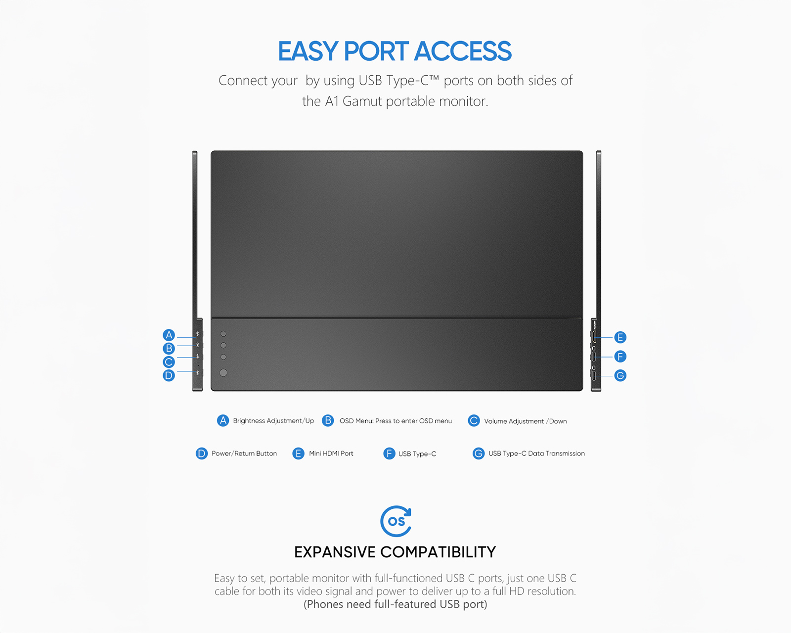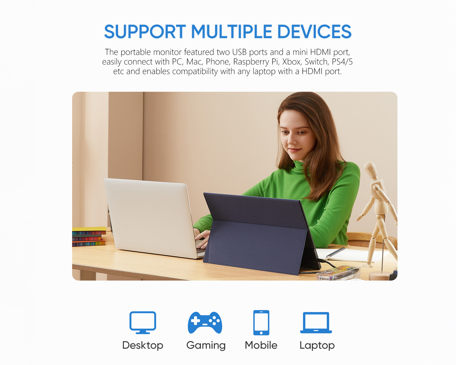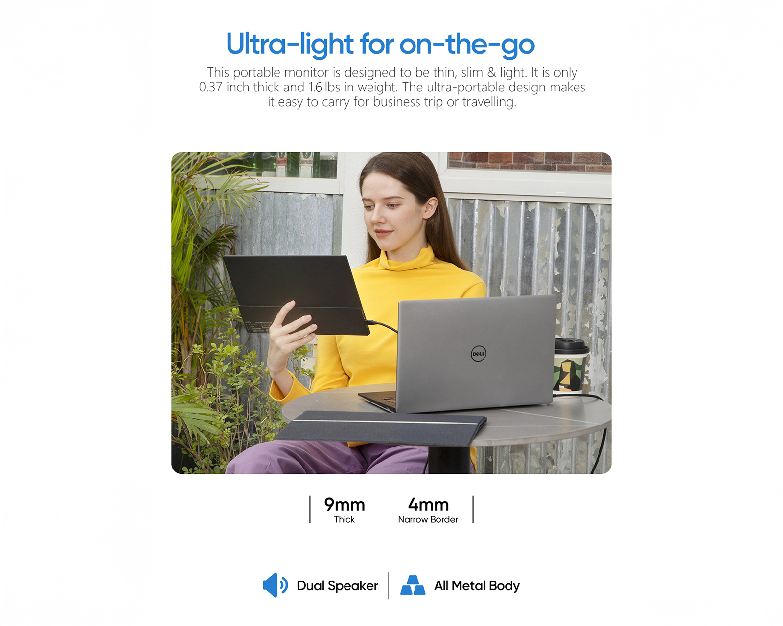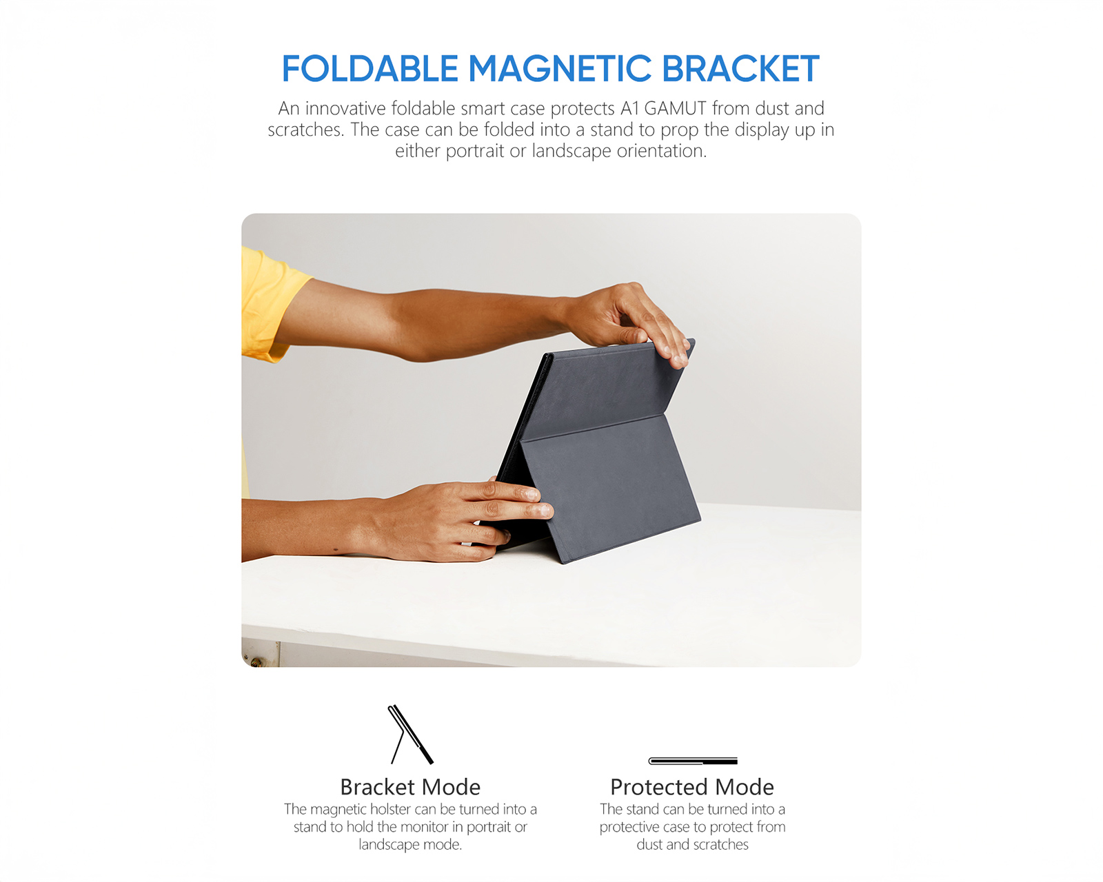 Enheten har en ultratynn profil og en robust byggekvalitet i CNC-anodisert aluminium, noe som gjør den både slitesterk og lett å ta med på reise. For maksimal fleksibilitet kobles den enkelt til via USB-C eller Mini-HDMI til bærbare datamaskiner, Mac, spillkonsoller (PS5/Xbox/Switch) og utvalgte mobiltelefoner. Lyd leveres via doble innebygde høyttalere, og det finnes også et 3,5 mm-utgang for hodetelefoner. Det medfølgende magnetiske smartetuiet beskytter skjermen under transport og fungerer samtidig som et justerbart stativ for optimal visningsvinkel.