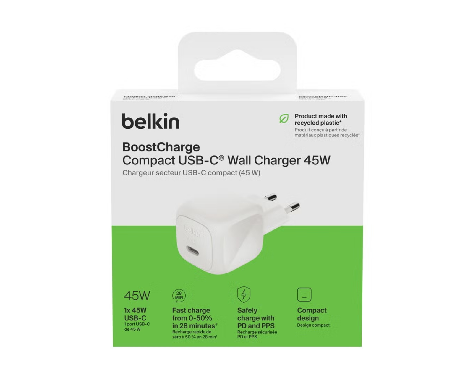 Denne laderen er USB-PD 3.1-sertifisert og leverer en effekt på 45W, som gir rask og sikker lading for alle kompatible USB-C-enheter. Belkin BoostCharge er laget av 72 prosent resirkulert plast, noe som bidrar til et mer bærekraftig produkt. Laderen kommer i en plastsnål emballasje og har et mål på 33,5 x 33,5 x 34,5 mm. Den har en enkelt USB-C-port for tilkobling og krever en separat ladekabel.