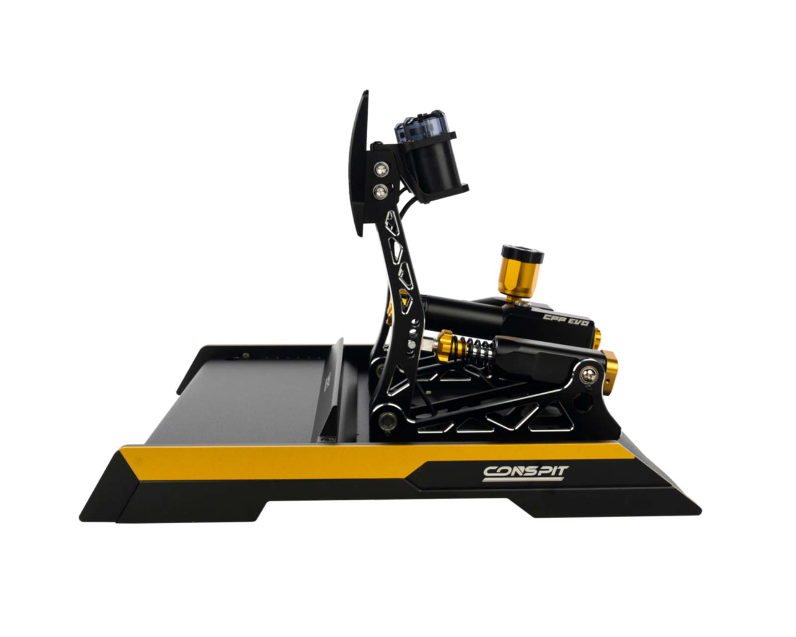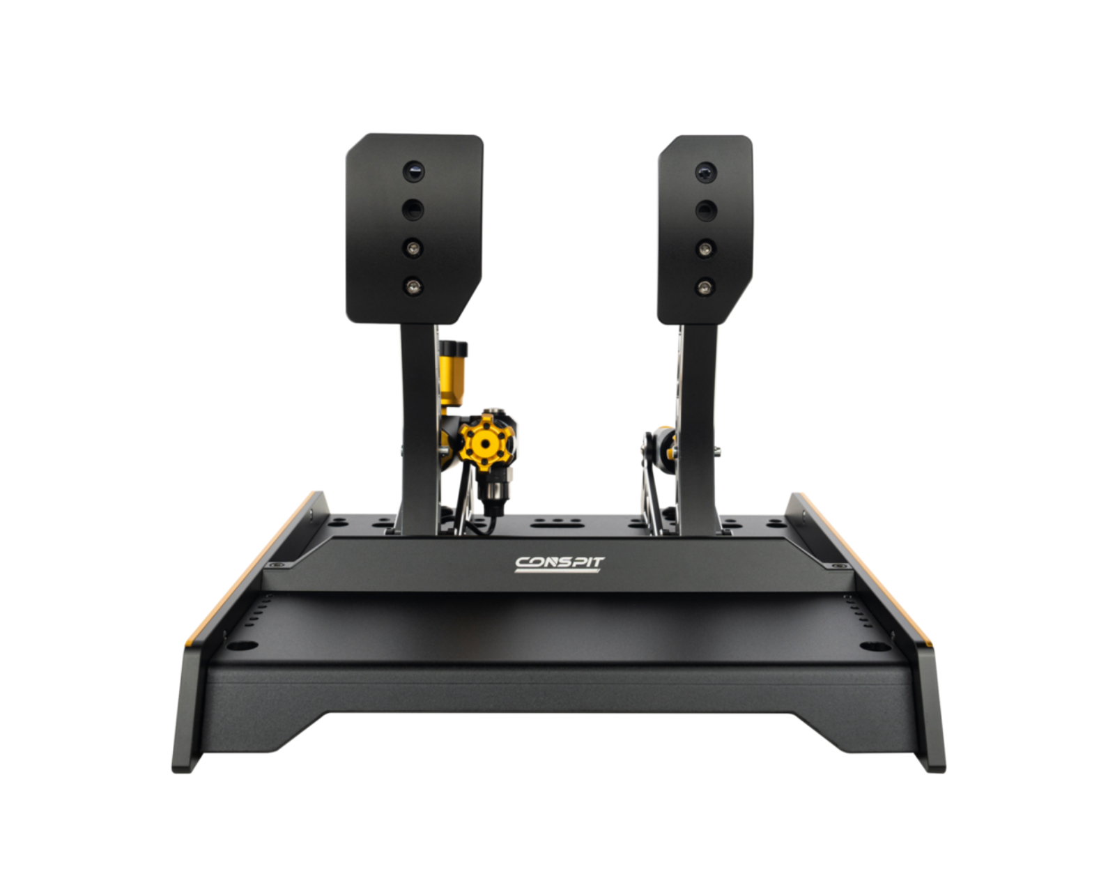 Modellen har doble hydrauliske sylindere for å muliggjøre dette og tilbyr verktøyfri justerbarhet for å finjustere følelsen av både gass og brems. Hver pedal har fire nivåer av kraftjusteringer, samt uavhengige innstillinger for bevegelse og forspenning. Konstruksjonen i 6061-T6 aluminium gir holdbarhet, mens den anodiserte overflaten beskytter mot slitasje. En integrert M-DVF vibrasjonsmodul formidler veigrus og motorlyd, noe som skaper en mer taktil opplevelse mens du spiller. Koble til med USB eller CONSPIT CAN for å bruke sammen med simuleringsprogram.