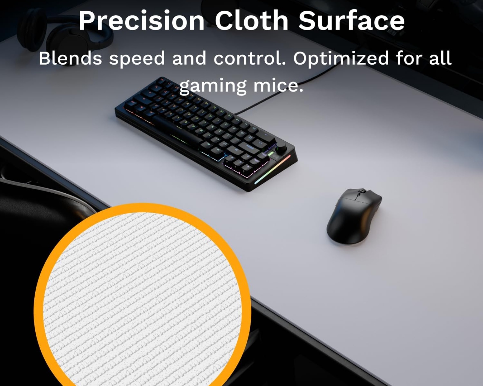 Museunderlaget er laget av et tett vevd stoff som muliggjør rask og smidig musebevegelse samtidig som det gir tilstrekkelig motstand for å sikre presis kontroll. Den søle-resistente barrieren gjør at væsker danner dråper på overflaten for enklere rengjøring og opprettholdelse av den glatte gliden. De lave kantene forhindrer flagging, noe som bidrar til komfort under lange spilløkter. Underlaget har en gripevennlig gummibunn som sørger for at det sitter stabilt på alle typer overflater, fra tre til glass. Det er optimalisert for både optiske og laserbaserte muse-sensorer, noe som sikrer høy sporingsnøyaktighet.