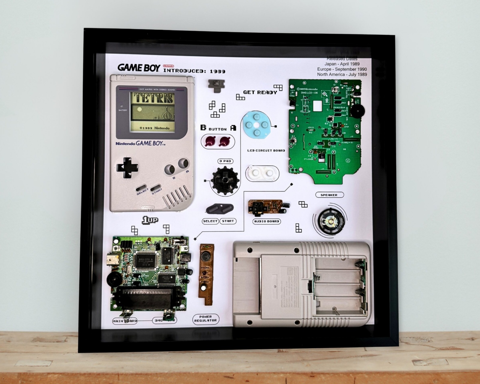 Enheten er laget av holdbare materialer som sikrer en langvarig holdbarhet. Designet inkluderer presise mål og en finish som omgir den historiske følelsen av den originale Nintendo Gameboy-konsollen. Enheten er lett å installere og kan plasseres på en hylle eller i et spillerom, noe som skaper en attraktiv visningsløsning for konsellentusiaster. Den er også skapt for å bevare konstruksjonens opprinnelige stil og det ikoniske utseendet til Gameboy.