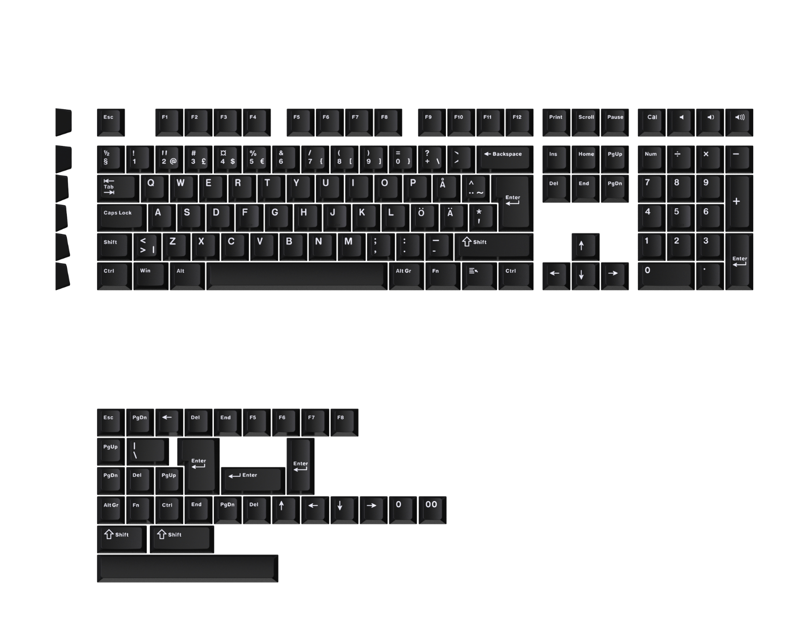 Keycaps-settet er laget av et robust PBT-materiale som er kjent for sin holdbarhet og motstandskraft mot smuss og fett. Cherry Double-Shot-teknologien innebærer at to plastlag brukes, noe som gir skarpe og holdbare trykk. Den nordiske ISO-layouten sikrer at hver tast er strategisk utformet for å skape en ergonomisk og effektiv brukeropplevelse. Ved å kombinere stil og funksjonalitet er disse keycaps en passende løsning for gamere og profesjonelle brukere.