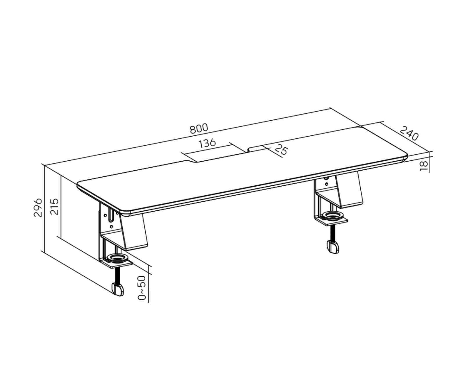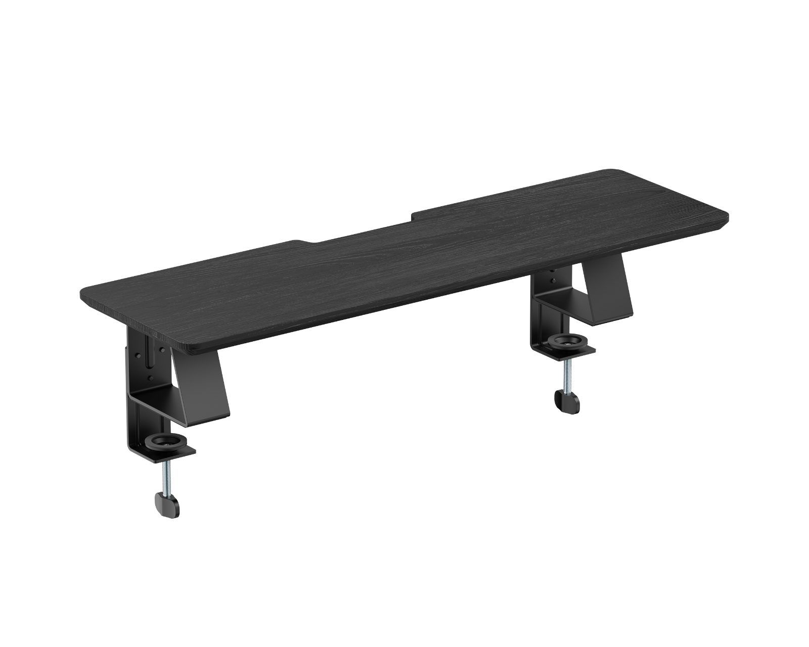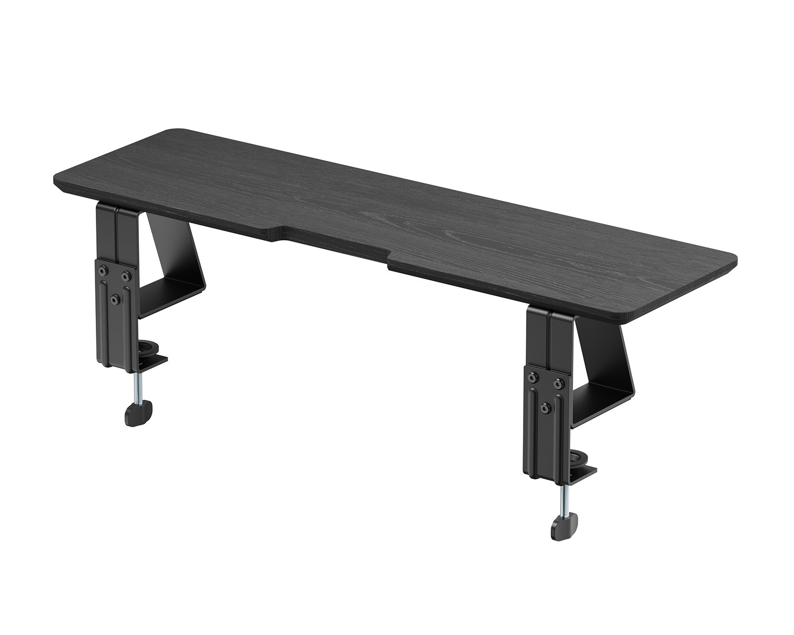 Kompakt skjermstativ med bordfeste har målene 800x240x296 mm og en overflatetjukkelse på 18 mm. Materialene består av stål og MDF med en pulverb coached overflate. Stativet har en vektkapasitet på opptil 30 kg per hylle og er utstyrt med klemfeste for sikker montering på bordet. De beskyttende føttene bidrar til stabilitet og forhindrer riper på bordets overflate. Kabelhåndteringssystemet letter orden og ryddighet rundt datakabelen.