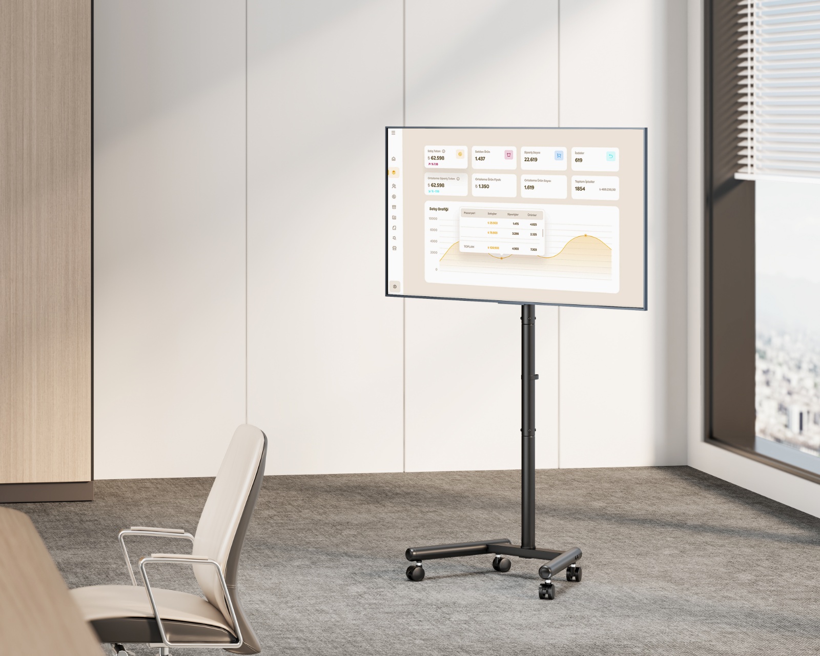 Stativet er laget av holdbart materiale og tilbyr en robust konstruksjon med en vektkapasitet på opptil 20 kg. Den har en inkludert VESA-kompatibilitet på 75x75, 100x100, 100x200, 200x100 og 200x200, noe som sikrer bred skjermpassform. Den tiltbare og roterbare designen tillater justering av synsvinkelen, mens de fire låsbare hjulene gir smidig bevegelse og stabilitet. En kabelklemme er inkludert for å minimere kabeltråder og holde installasjonsområdet ryddig.