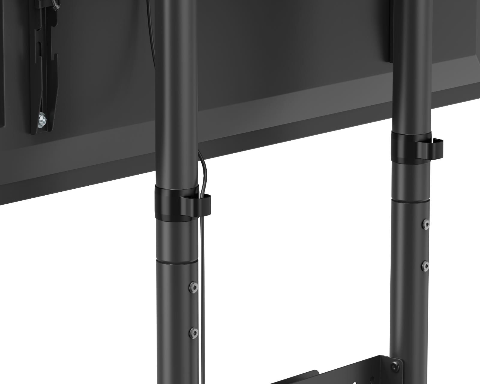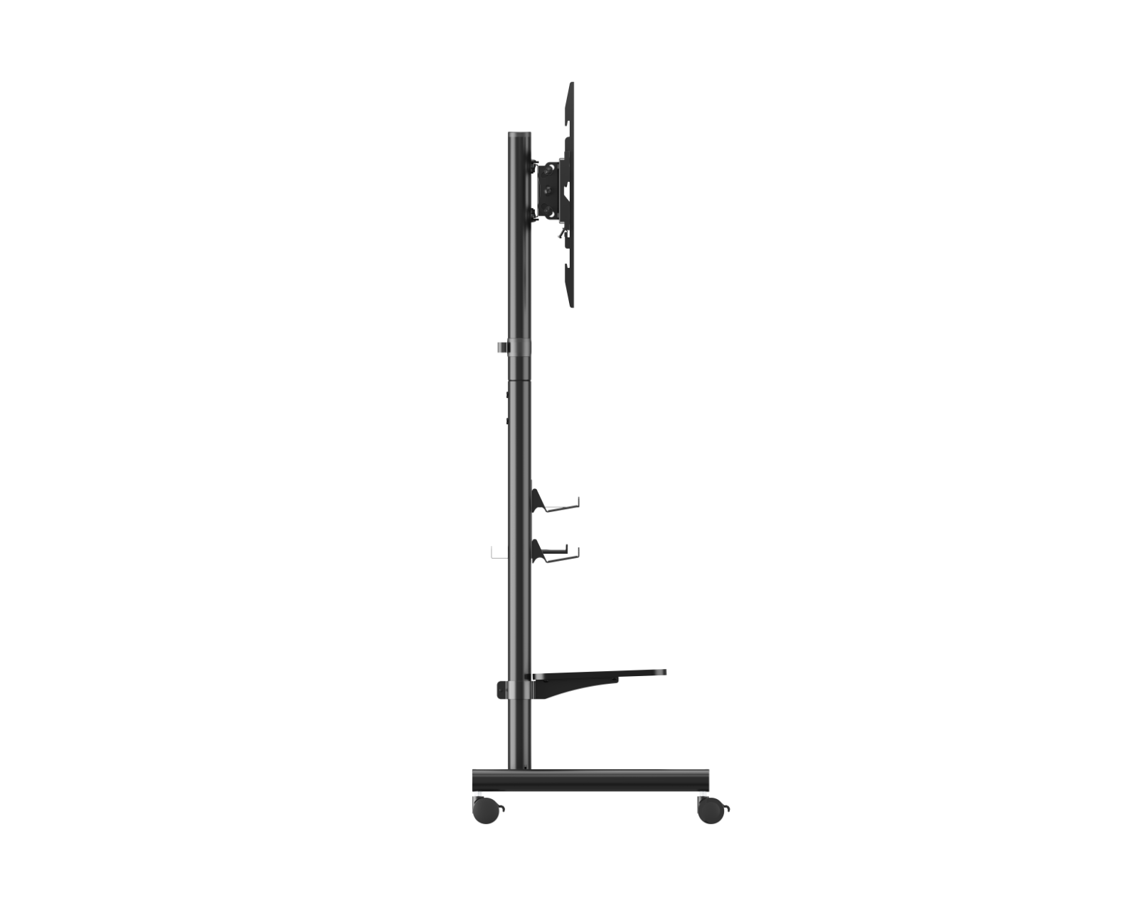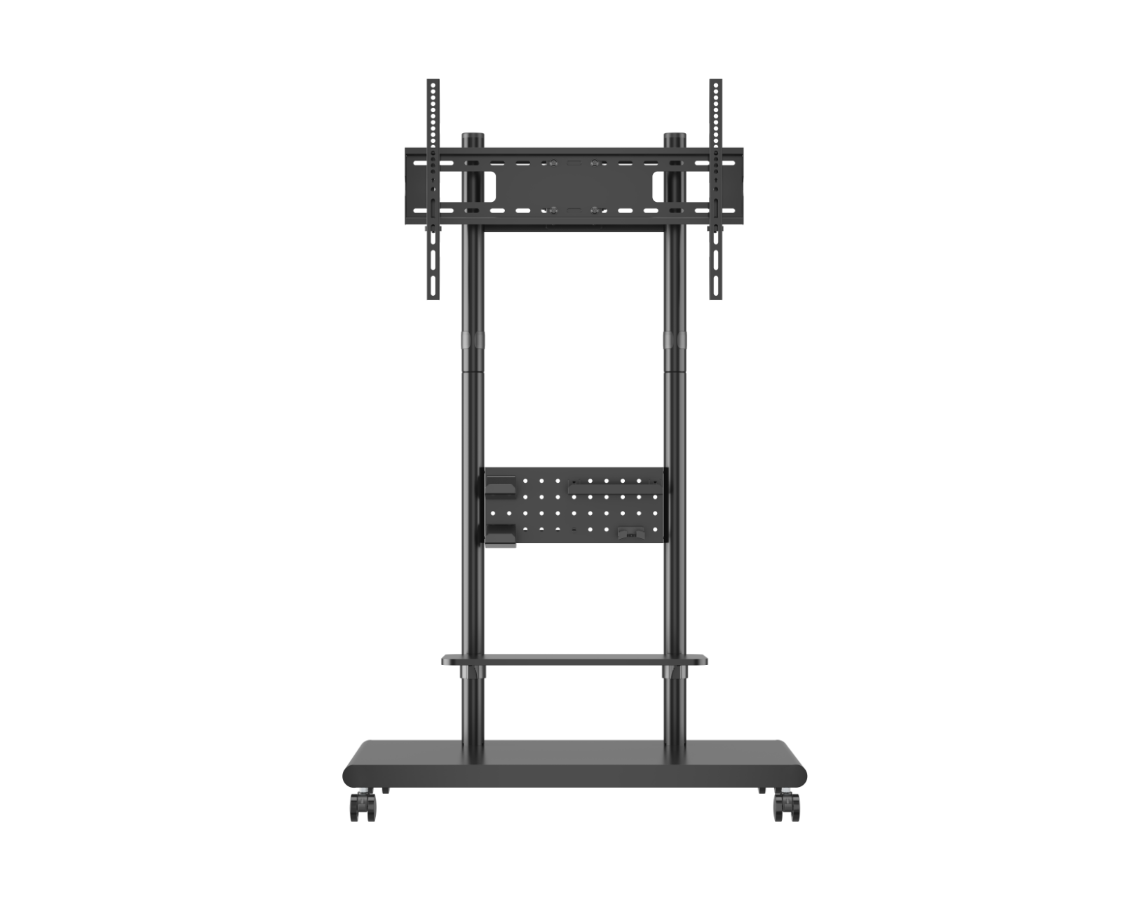 Enheten er konstruert med fokus på stabilitet og holdbarhet, noe som sikrer pålitelig ytelse under bruk. Pegboard-hyllen muliggjør en ryddig oppbevaring av kabler og tilbehør, noe som reduserer rot. Utstyrt med låsbare hjul for enkel manøvrering og en sikker plassering av TV-en. Høydjusteringen er fleksibel og tilpassbar for å optimalisere sikten. En integrert kabelhåndtering sikrer at alle kabler håndteres på en ordnet måte.