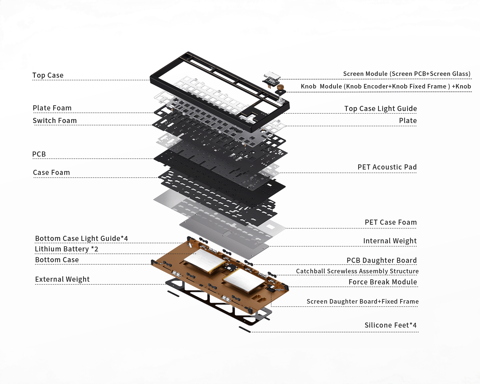 ZOOM TKL DYNA er et barebones-kit fra Wuque Studio som tilbyr en allsidig brukeropplevelse. Den modulære designen muliggjør justeringer av skjermen og kontrollene, noe som gir brukerne frihet til å tilpasse innstillingene sine. Enheten har et 6063 aluminiumsbelte og et skruftfritt kulelåssystem for enkelt å bytte mellom forskjellige monteringsalternativer. Den har støtte for både kablet tilkobling via USB-C og trådløs via Bluetooth 5.4 og 2.4 GHz.