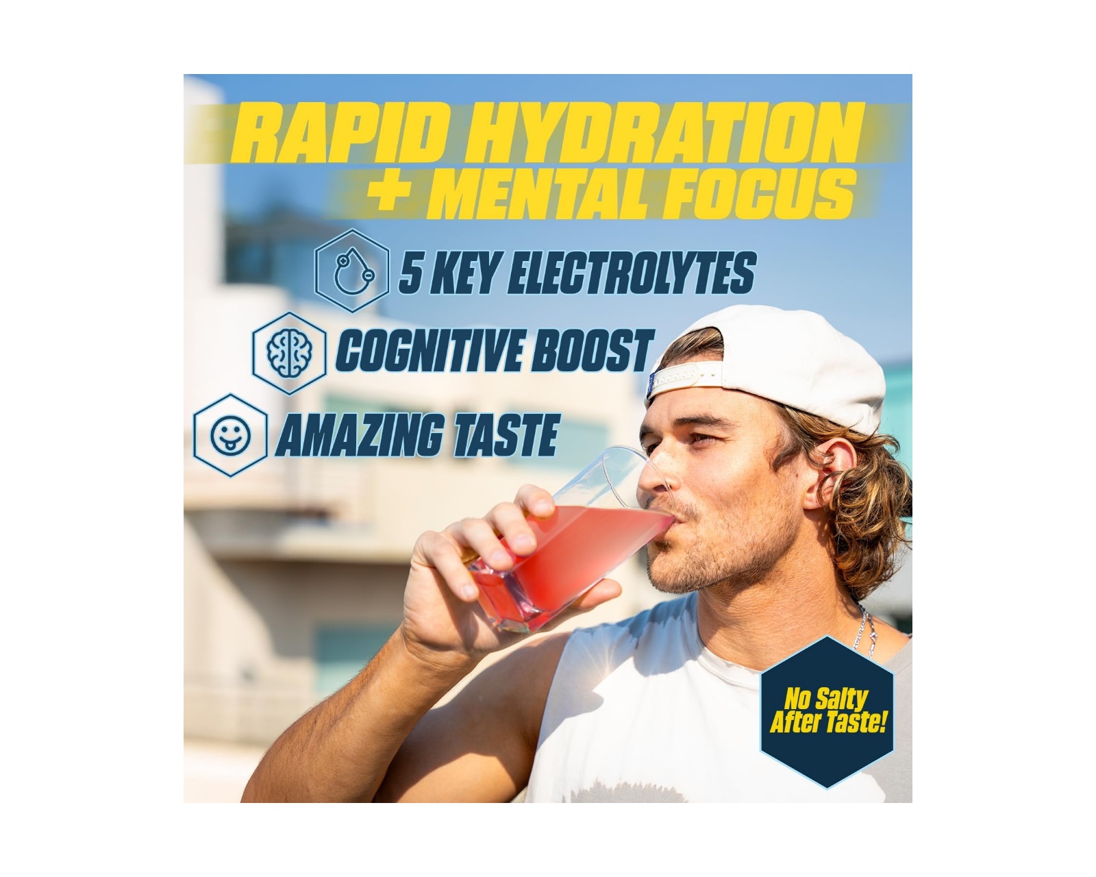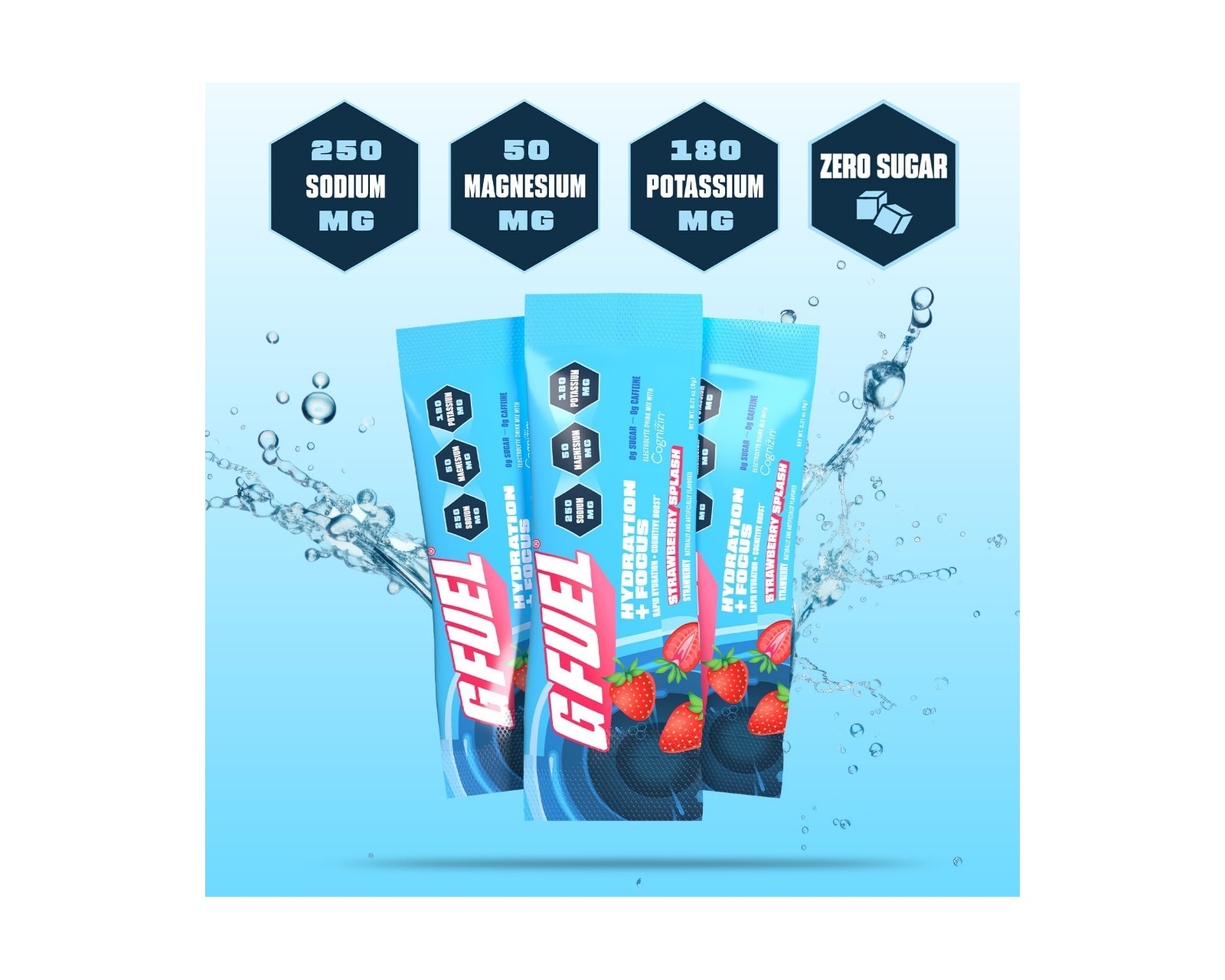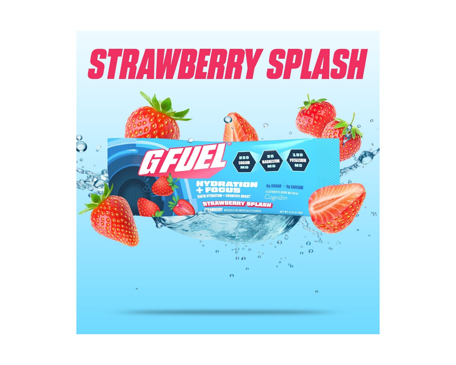 Jordbær-splash Hydration + Focus Pack er et elektrolyttpulver fra G Fuel som tilbyr rask hydrering og støtte for mental klarhet. Produktet er sukkerfritt og har en smak av jordbær, noe som gjør det til en passende drikke for gamere og personer som trenger ekstra fokus under aktiviteter. Hver pakke inneholder 20 porsjoner.Produktet inneholder en avansert blanding av fem viktige elektrolytter, som sikrer optimal hydrering og klar mental fokus. Pulvret inneholder 250 mg natrium, 50 mg magnesium og 180 mg kalium per porsjon, noe som effektivt støtter hjernens kapasitet uten en salt ettersmak. Pulvret er formulert med Cognizin for å fremme oppmerksomhet og minne.