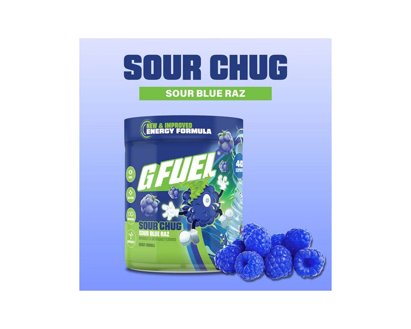 Sour Chug 2.0 fra G FUEL som kombinerer en forfriskende smak med høyt koffeininnhold.Den inneholder 140 mg koffein per porsjon og tilbyr 40 serveringer.
