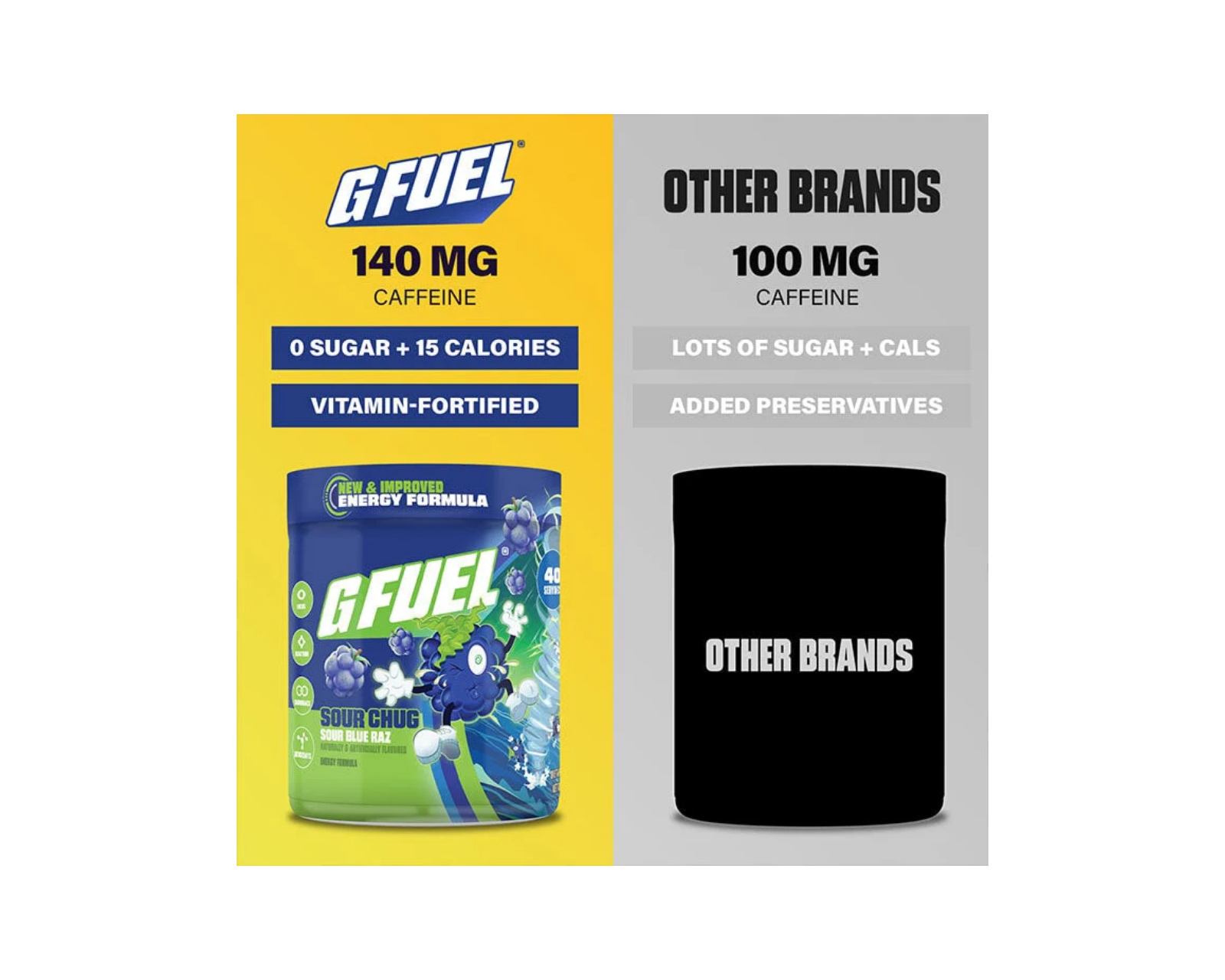 G FUEL Energy Drink er det ultimate tilskuddet for gamere, kreatører, studenter og idrettsutøvere. Med sin nøye utformede, sukkerfrie oppskrift og førsteklasses ingredienser gir G FUEL deg den perfekte kombinasjonen av energi, fokus og utholdenhet til å takle alle utfordringer du møter i løpet av dagen.