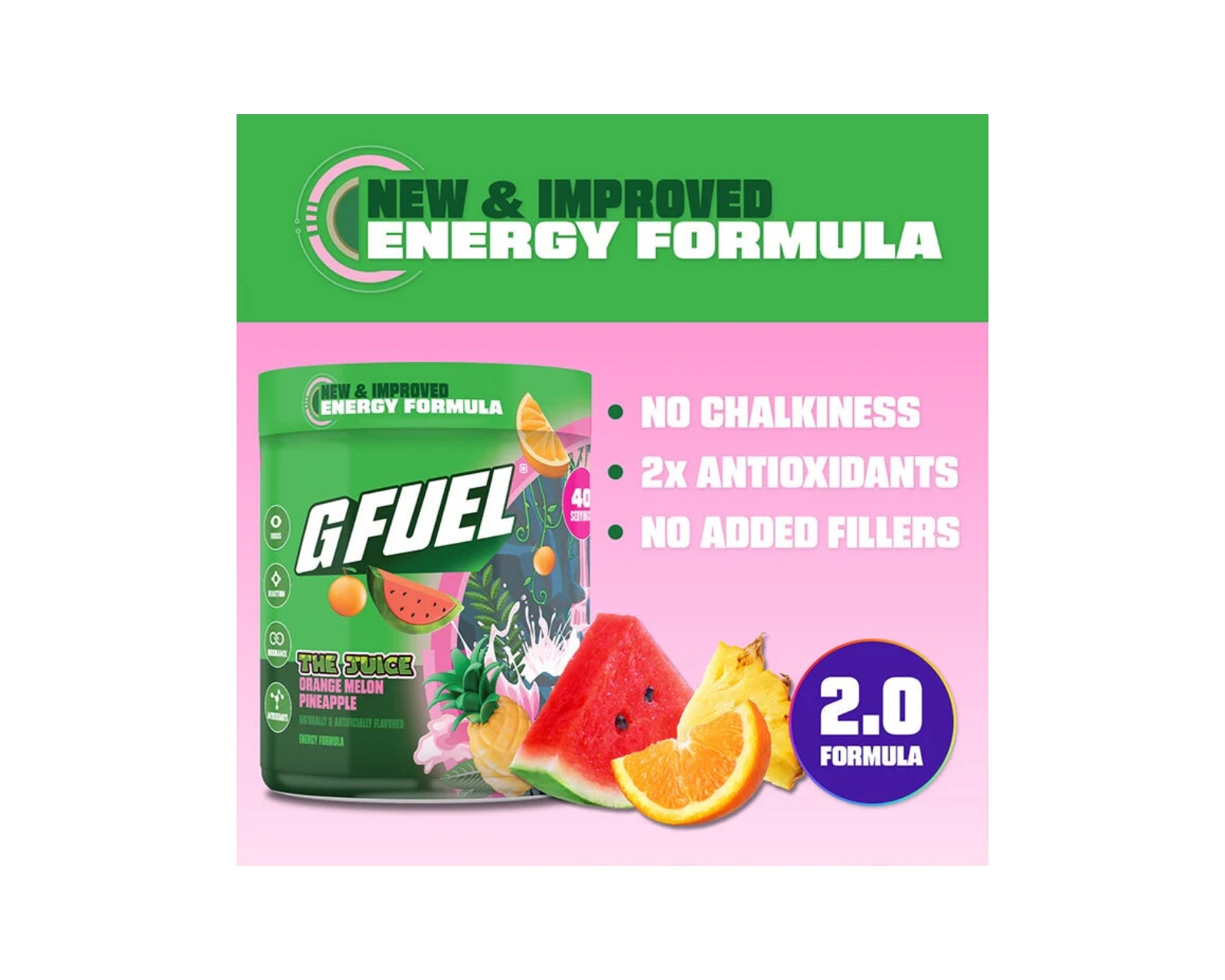 Juice 2.0 fra G FUEL som tilbyr en utsøkt blanding av smaker med sin unike kombinasjon av appelsin, melon og ananas. Med 140 mg koffein per porsjon gir dette produktet en optimal energikick uten tilsatt sukker, noe som gjør det mulig å nyte en god smakopplevelse som ikke belaster kroppen.Produkten er spesielt utviklet for gamere og aktive individer som ønsker en ren energikilde. Med null sukker og ingen fyllstoffer, eliminerer den risikoen for energikrasj som ofte følger med sukkerholdige drikker. I tillegg inneholder hver porsjon vitaminer som B6, B12 og niacin, som støtter både fokus og energi under intense spilløkter.