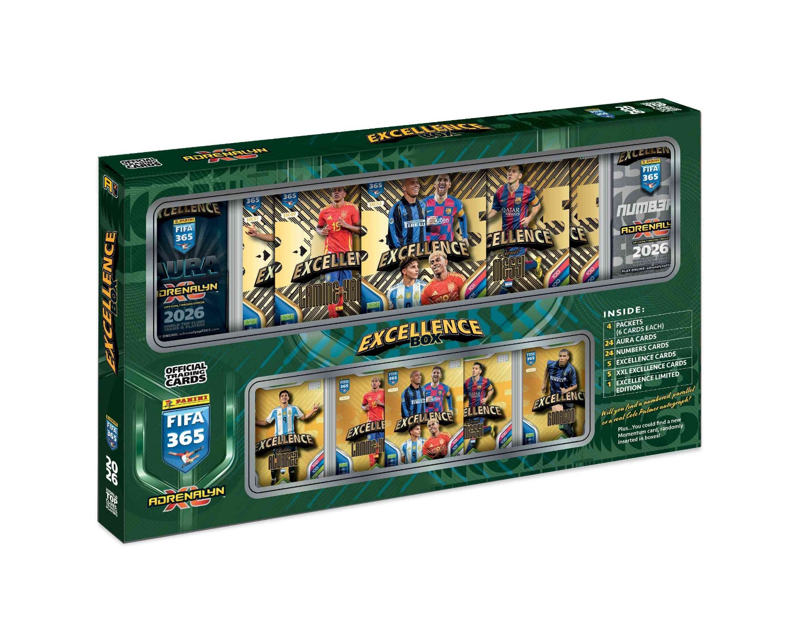 FIFA 365 Adrenalyn XL 2026 Excellence Box er en samlerboks fra Panini som inneholder kort relatert til fotball, inkludert forskjellige kjendiser og lag. Denne boksen er designet for samlere og fotballfans som ønsker å utvide kortsamlingene sine med en blanding av spesialkort og vanlige kort. Hovedkomponentene inkluderer 82 kort som er fordelt i 4 eksklusive boosterpakker med Aura-kort, 4 eksklusive boosterpakker med Numbers-kort, 4 vanlige boosterpakker og flere Excellence-kort.Boksen tilbyr flere spesialmateriale og underkategorier som øker samleverdi, inkludert Limited Edition-kort, parallelle kort og kort med ekte autograf. Kortene er også numrerte for økt unikhet. Hver boosterpakke inneholder 6 kort, noe som totalt gir 24 Aura-kort og 24 Numbers-kort. I tillegg inngår 5 eksklusive Excellence-kort og 5 XXL Excellence-kort for dem som søker noe ekstra.