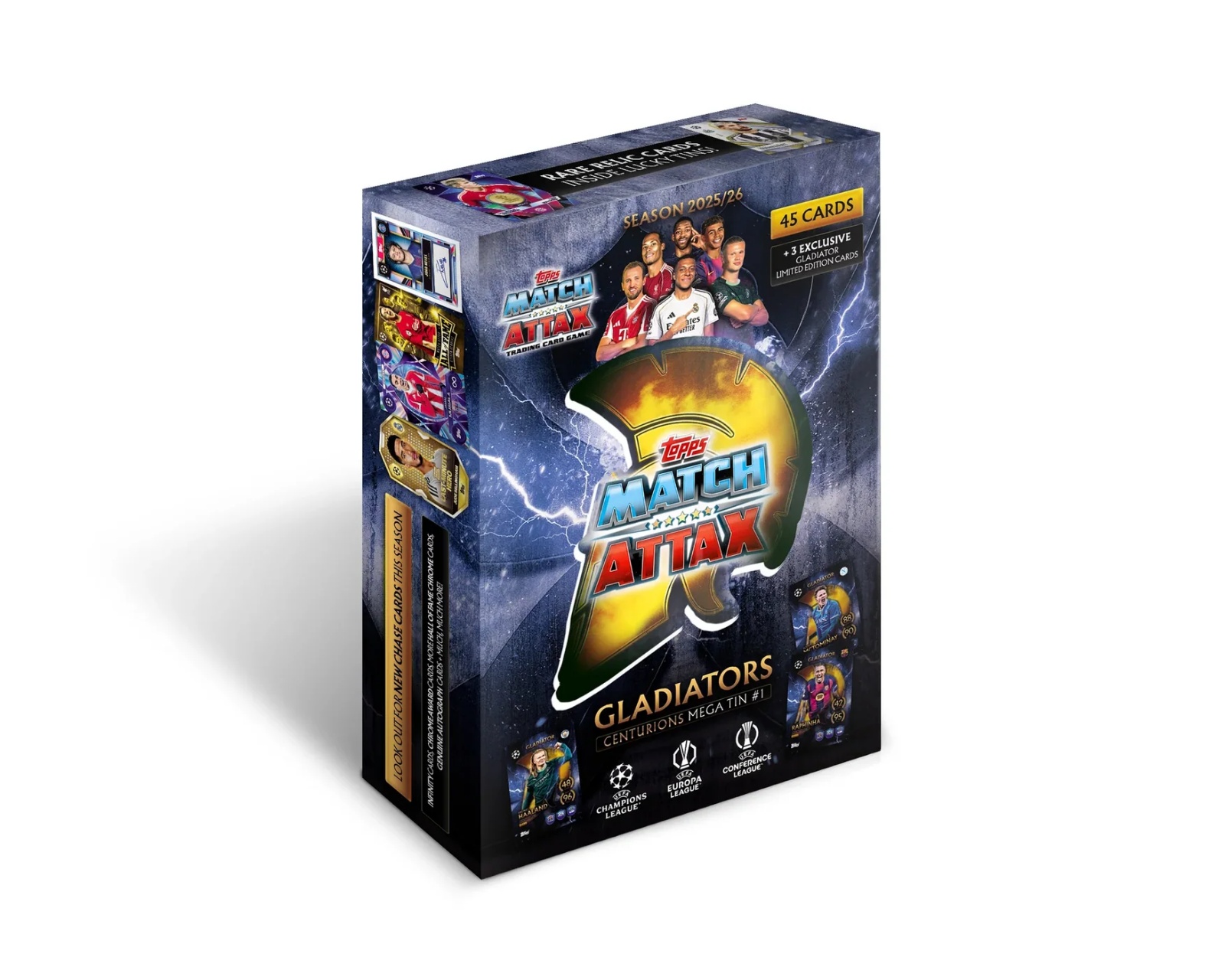 Match Attax Mega Tin UCL 25/26 er en samling fotballkort fra Topps som inneholder 45 kort fra UEFA Champions League, UEFA Europa League og UEFA Europa Conference League. Denne kolleksjonen tilbyr 524 nye kort, med kategorier som Leaders, Cup Champions, Showboats, Magic Memories, Stealth Strike og Counter Attack, samt tilbakevendende elementer som Heritage og Team Badges. Produkten velges tilfeldig ved bestilling.Den bygges på en robust kvalitet og tilbyr et variert utvalg av kort, inkludert sjeldne varianter som Black Edge, Infinity-kort og Platinum Pull-kort. I kolleksjonen finnes også unike Hall of Fame Chrome-kort og Black Gold LE. Samleren kan også oppdage nye kort, som det spesielle Red Hot Yamal-kortet og Ice Cole Palmer-kortene. I tillegg inkluderer utvalget relikkort som er eksklusive for Booster og Mega Tins, samt autografkort som Lethal Combo Auto.