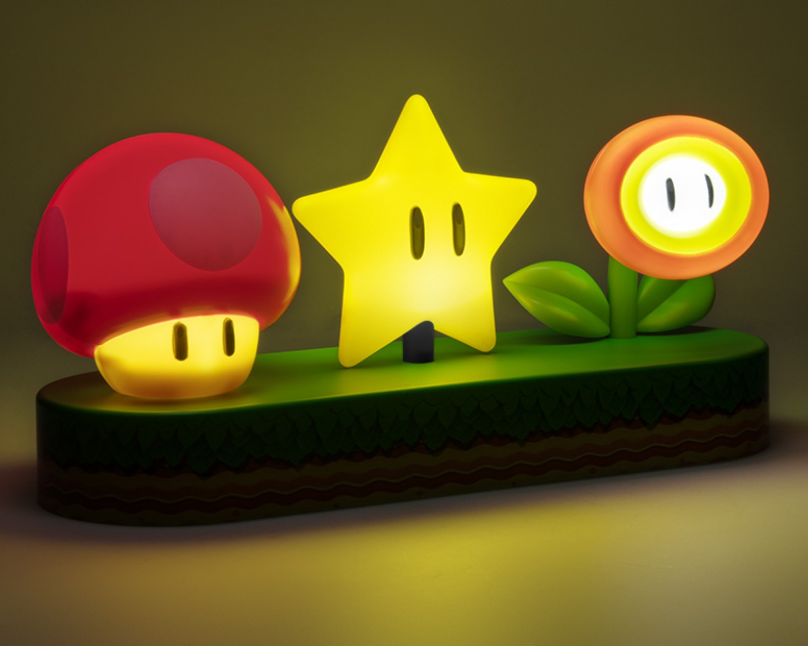 Super Mario™ Icons Light er en dekorativ bordlampe fra Paladone som kombinerer nostalgi og anvendelighet. Denne belysningsløsningen er 30 cm bred og omfavner tre klassiske "power-up"-objekter fra Super Mario-universet: Super Mushroom, Super Star og Fire Flower. Disse spennende detaljene lyser opp når lampen er på, noe som skaper en atmosfære som er perfekt for gamere og fans av Super Mario.Lampene tilbyr attraktive funksjoner, som en belysningsfasemodus der hver power-up lyser opp én og én, noe som gir underholdende visuelle effekter. I tillegg finnes det en musikkreaktiv funksjon som tilpasser lyset etter lyden, noe som forsterker opplevelsen ytterligere. Strømmen kan leveres via USB (kabel følger med) eller med 3 AAA-batterier (ikke inkludert), noe som gir fleksibilitet i hvordan du ønsker å bruke den. Denne lampen er et utmerket tilskudd for enhver gamer som ønsker å skape en inspirerende spillmiljø.