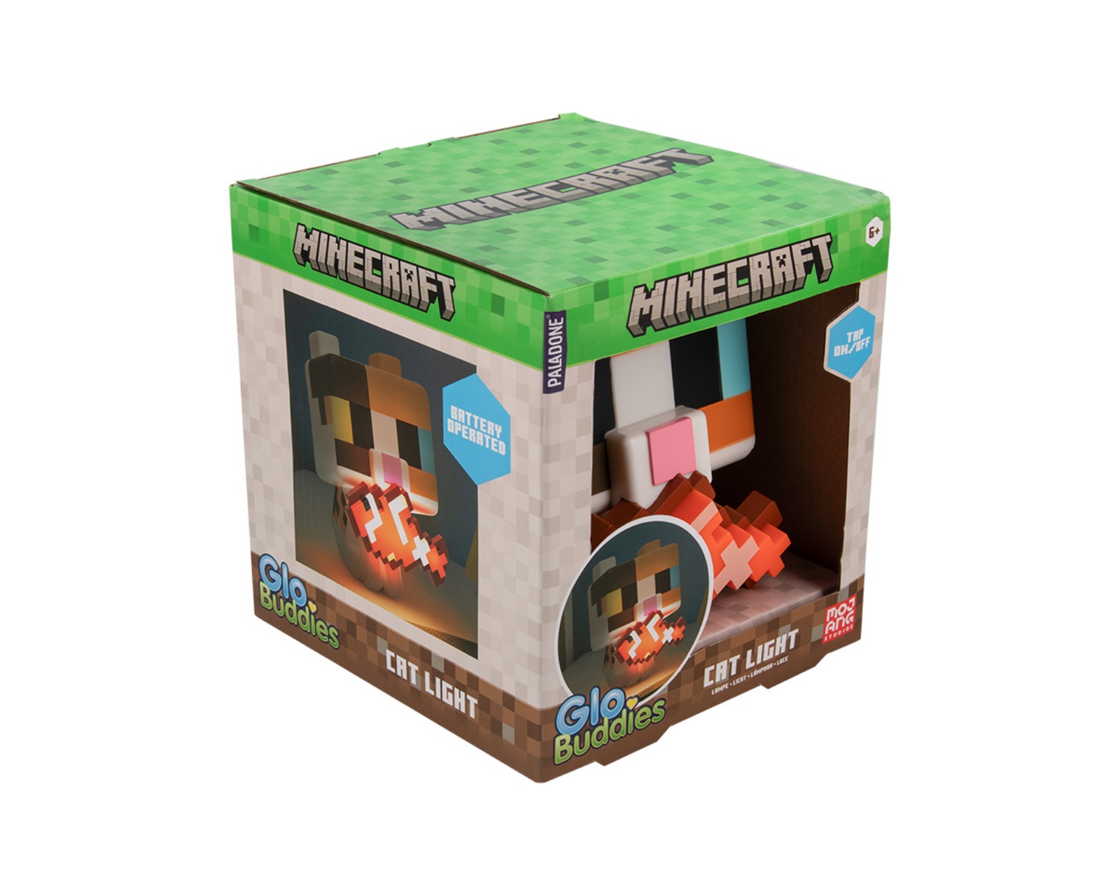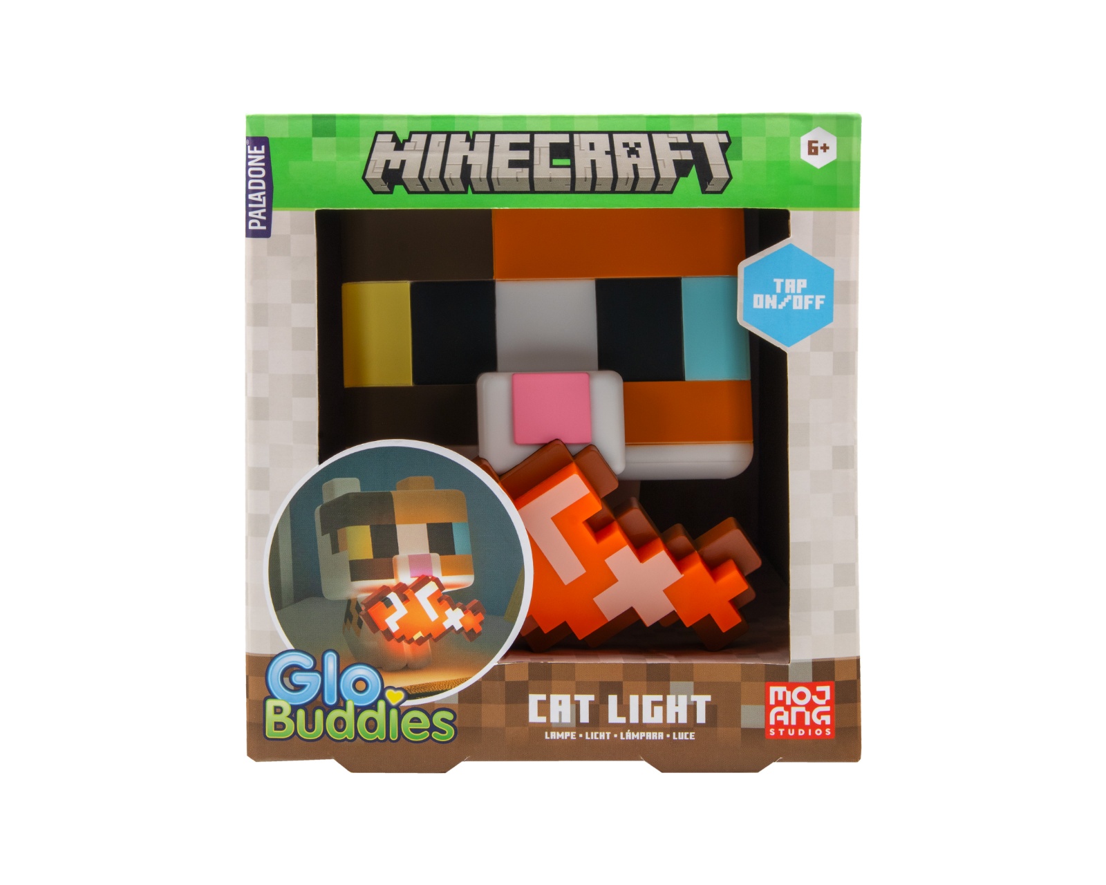 Minecraft Cat GloBuddies lampe er en dekorativ belysning fra Paladone som gir liv til rommet ditt. Denne 3D-figuren står 15 cm høy og representerer det populære spillets kalico-katt med en sjarmerende, lysende fisk i munnen. Den er enkel å bruke; trykk for å slå på og trykk igjen for å slå den av. Lampen drives av 2x AA-batterier (inngår ikke), noe som betyr at ingen ledninger kreves for å sette i gang belysningen.Minecraft Cat GloBuddies lampen er ideell som nattlampe og passer perfekt på skrivebord, hyller eller nattbord. Figuren er nøye utformet for å etterligne spillets grafikk, noe som gjør den til et utmerket tilbehør for både gamere og Minecraft-entusiaster. Lampen tilbyr en myk, varm glød som skaper en hyggelig atmosfære i hvilket som helst rom. Med sin kompakte størrelse er den lett å plassere og kan heve stemningen i hjemmet ditt.