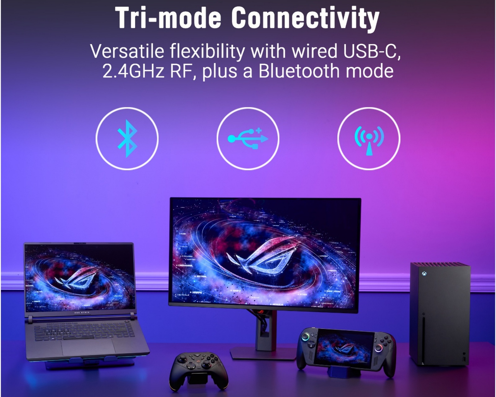- Tri-mode: 2.4GHz RF, Bluetooth, USB-C