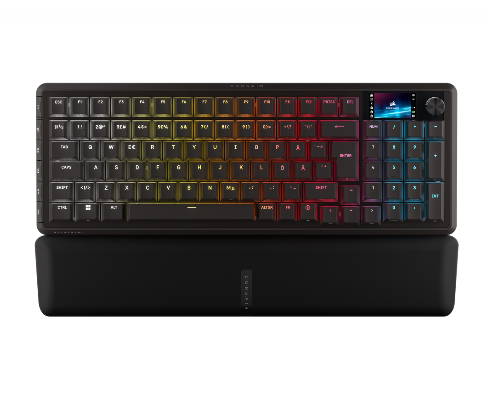 Vanguard 96 er et 96% fullstendig gamingtastatur fra Corsair som tilbyr et balansert design med piltaster og numerisk tastatur. Med en integrert LCD-skjerm og en praktisk ratt for justering, gir dette tastaturet en brukervennlig og funksjonell opplevelse. Det er konstruert for gamere som verdsetter både ytelse og fleksibilitet, samtidig som det tilbyr et komprimert format lik TKL-tastatur.Byggekvaliteten til Vanguard 96 er tydelig med sin robuste konstruksjon og bruk av høykvalitets materialer. Tastaturet støtter Elgato Virtual Stream Deck-integrasjon, noe som muliggjør sømløs kontroll av dine strømmer eller applikasjoner. Med 8 kHz trådløs hyper-polling og FlashTap SOCD-håndtering, reduseres latensen betydelig og maksimalt utnytter tastaturets responsivitet. I tillegg gir CORSAIR Web Hub web-basert tilpasning, som gjør det mulig for brukere å skreddersy tastaturet etter sine spesifikke behov.
