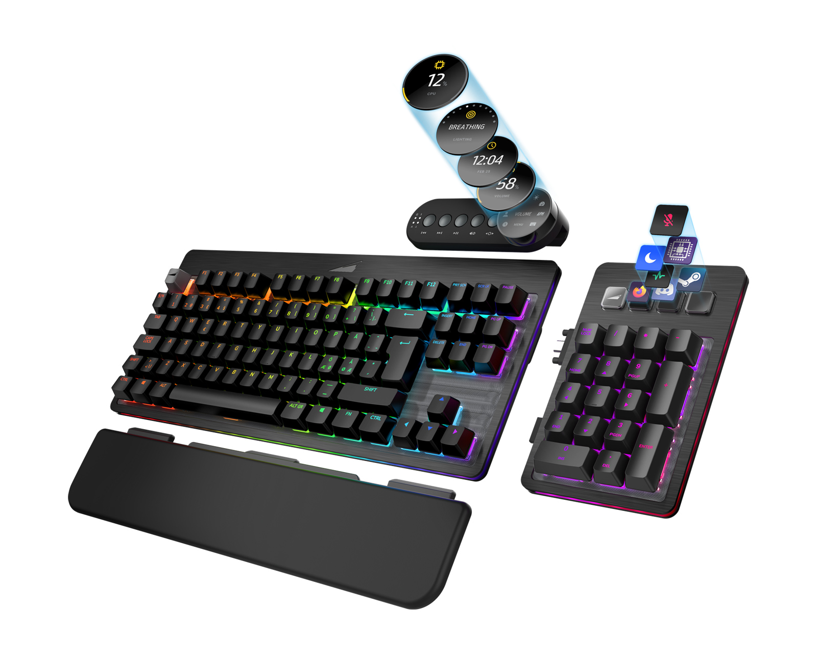 En hel fjellkjede med kontroller og informasjon på toppen av tastaturet. Dessuten den første i sitt slag med skjerm! Bortsett fra lett tilgjengelige mediekontroller, lar skjermen deg overvåke systemet ditt, se eller bytte profiler. For å maksimere effektiviteten din kan du endre de fire skjermknappene på numeriske tastaturet til ditt hjertes ønske. Velg dine favorittsnarveier, makroer eller hurtigtaster og velg et bilde for å gjøre dem til dine egne.