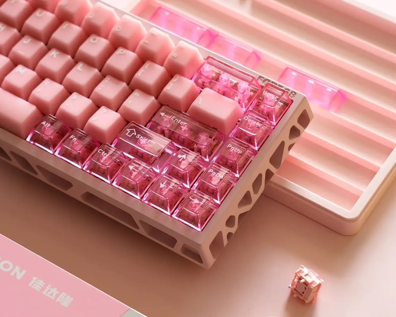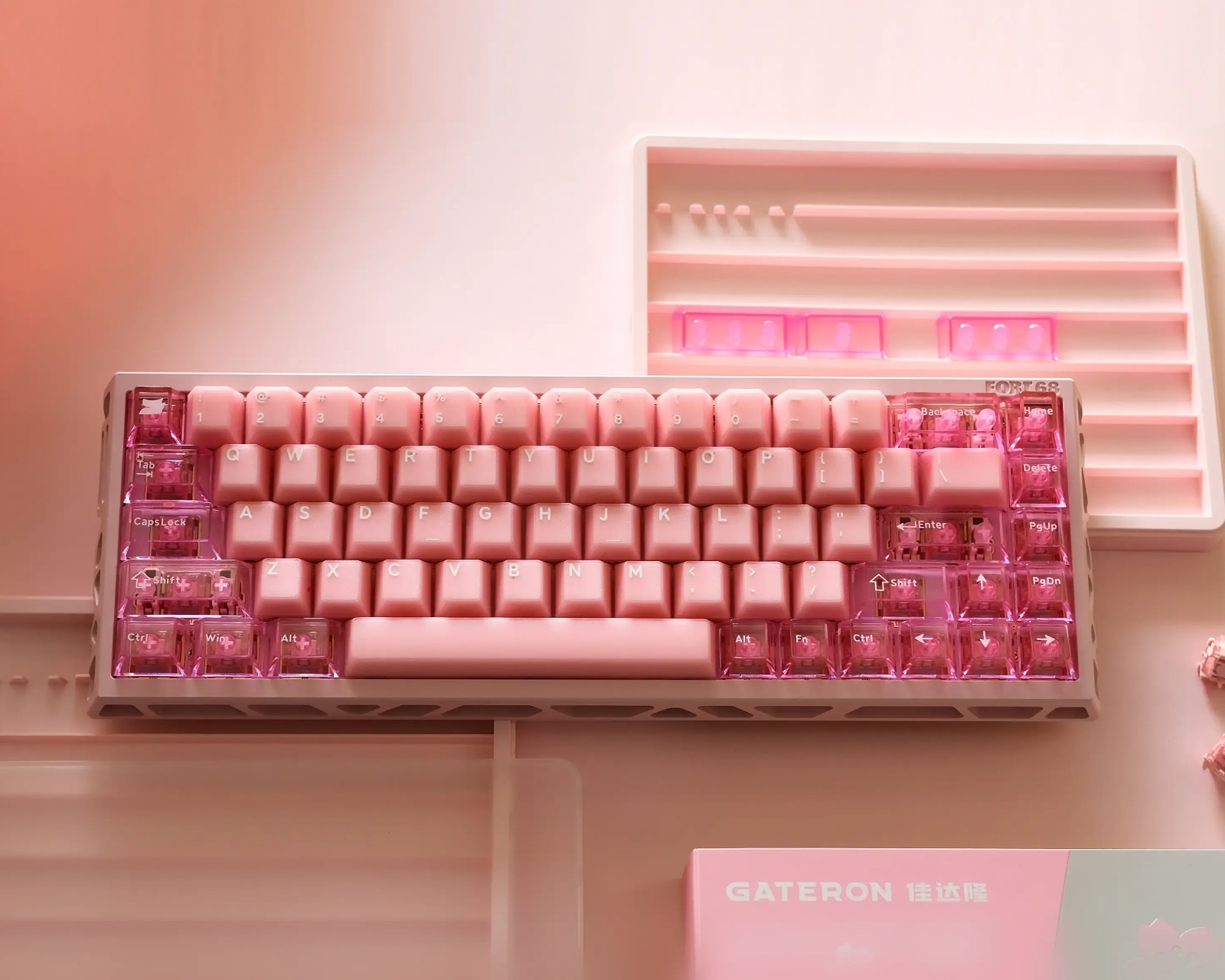 GATERON FORT 68 Sakura er et 68-tasters mekanisk tastatursett fra Gateron, designet med et sanntids optisk system og magnetiske brytere. Tastaturet tilbyr en forhåndsmontert layout med en tri-splittet modulær mellomromstast for forbedret interaktivitet og tilpasningsevne. Det reagerer umiddelbart på inndata med lyseffekter, noe som gir en mangfoldig skriveopplevelse.Tastaturet er utstyrt med et patentert tri-splittet design som muliggjør modulær fleksibilitet og stabilitet. Den magnetiske bryteren har forbedret tilbakemelding med rask retur, noe som er fordelaktig for gamere. I tillegg er tastaturet beskyttet med nanoskala vanntett modul, noe som gjør at det tåler søl. Latensen er enestående med en nøyaktighet på 0,01 ms og en latens på < 0,125 ms for smidigere bruk.
