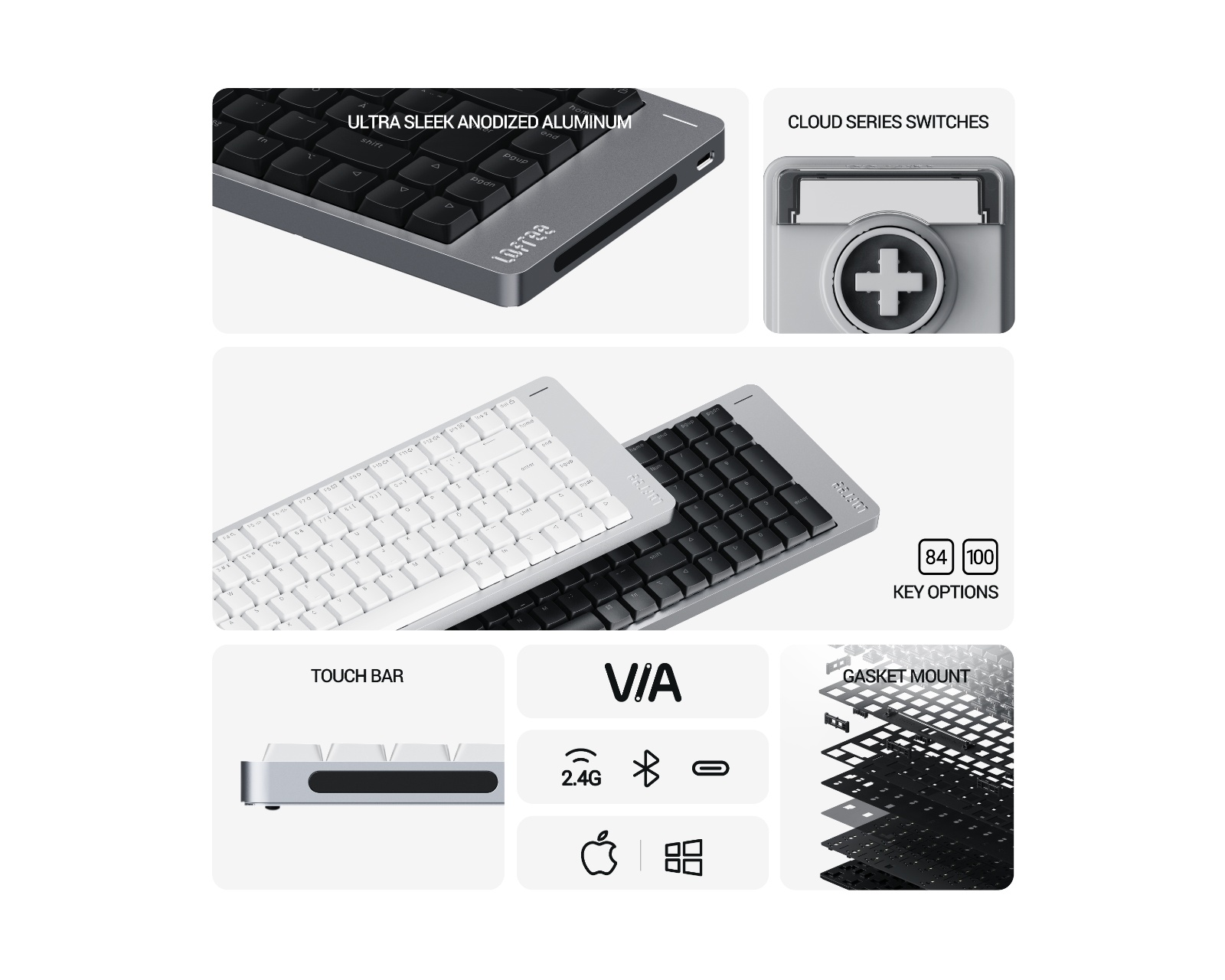 Flow 2 84 Låprofil Mekanisk Tastatur fra Lofree tilbyr et låprofil design medKailh Surfer Linear brytere for en stille og presis skriveopplevelse. Tastaturet har et anodisert aluminiumskropp og en mengde funksjoner som gjør det til et utmerket valg for brukere som verdsetter både ytelse og estetikk.Bygget av en enkelt blokk av aluminium gir Flow 2 en robust og stilren følelse. De nye Cloud Series bryterne, med en toleranse på kun 0.04mm, sikrer at hver tastetrykkbevegelse er presis og responsiv. Tastaturet er utstyrt med et trykkfølsomt reglage for justering av volum og skjermens lysstyrke samt en innebygd støtte for bedre ergonomi. Med tri-mode tilkobling kan brukere enkelt veksle mellom 2.4GHz, Bluetooth og USB-C, noe som gir stor fleksibilitet i bruken.