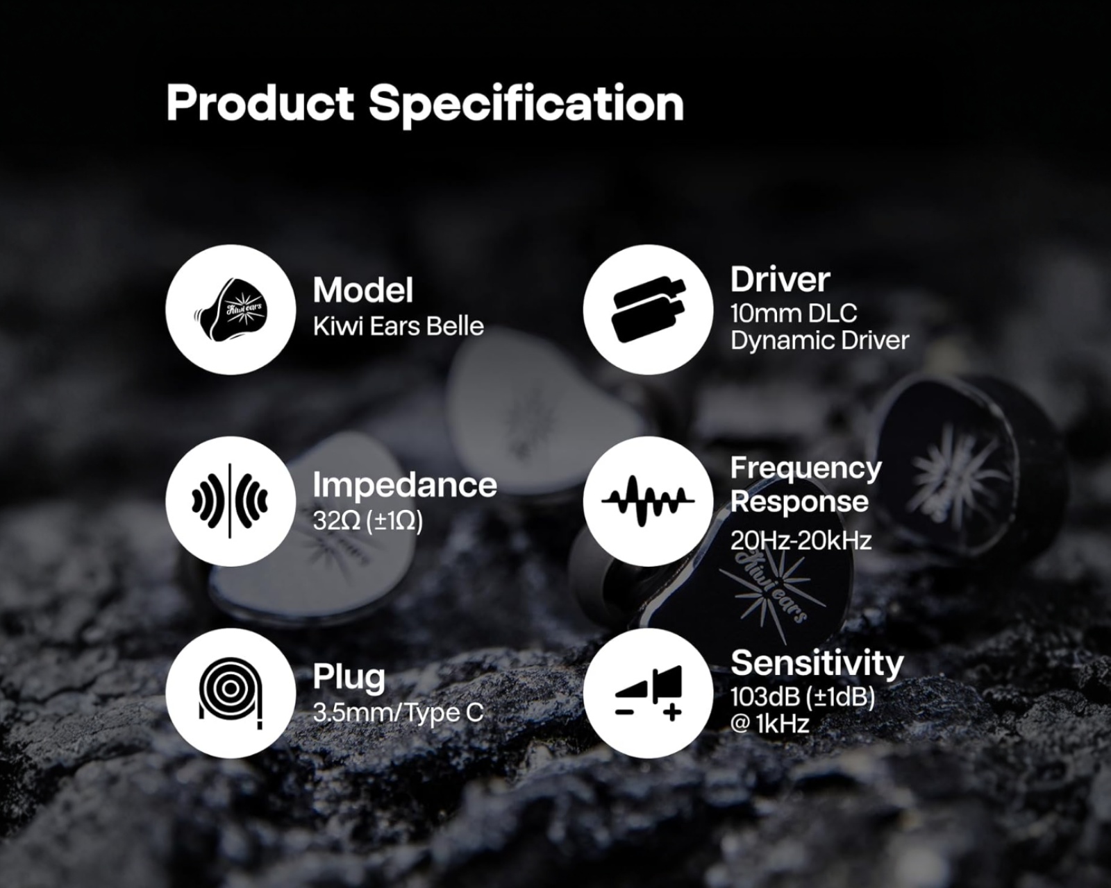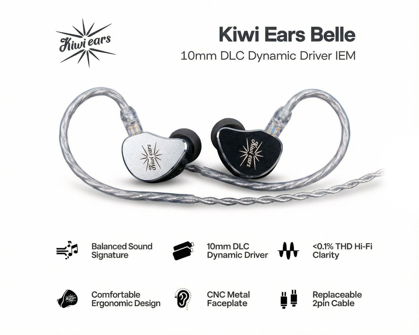 Kiwi Ears Belle er en profesjonell in-ear monitor (IEM) som kombinerer en 10 mm DLC-dynamisk driver med et tiltalende design og høy lydkvalitet. Med en impedans på 32 Ohm og en balansert tonal signatur, er Belle designet for å gi en engasjerende lytteopplevelse, uansett om det handler om musikkproduksjon, spilling eller liveopptredener. Det er et allsidig headset som håndterer ulike musikksjangere med dyp bass og klare mellomtoner, noe som gjør den ideell for både audiophiler og profesjonelle brukere.Bygget med CNC-bearbeidede metallfrontplater, tilbyr Belle en premium følelse og holdbarhet. Den nyeste generasjonen av Kiwi Ears Diamond-Like Carbon (DLC) membran bidrar til en snappere og mer responsiv lydgjengivelse, med en total harmonisk forvrengning (THD) på mindre enn 0,1% ved 1 kHz. Kabelalternativene inkluderer type C og 3,5 mm, noe som gir fleksibilitet avhengig av enhetsbruk. Den sølvbelagte kabelen maksimerer signaloverføringen og evnen til å gjengi høyfrekvente detaljer, noe som gir en overlegen lytteopplevelse. Belle er ment for dem som søker den beste lyden både på farten og under liveopptredener.