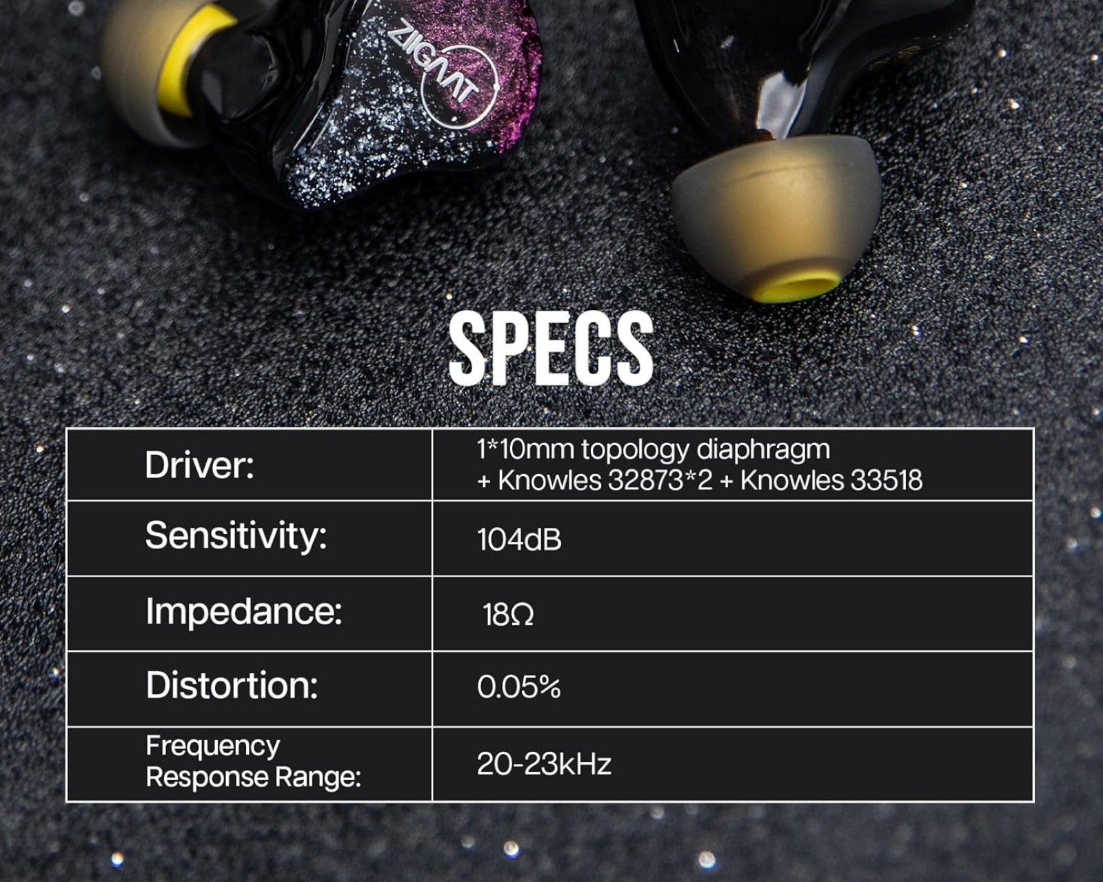 - Driver: 1 x 10 mm Topologisk åpning + Knowles 32873 x 2 + Knowles 33518
