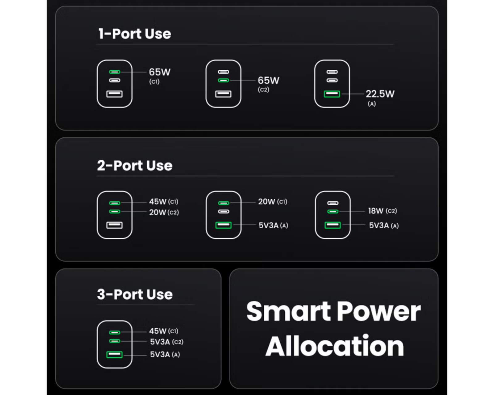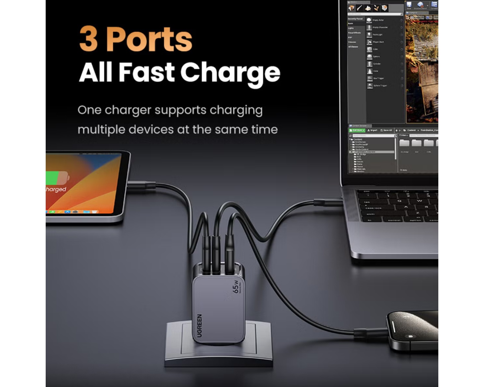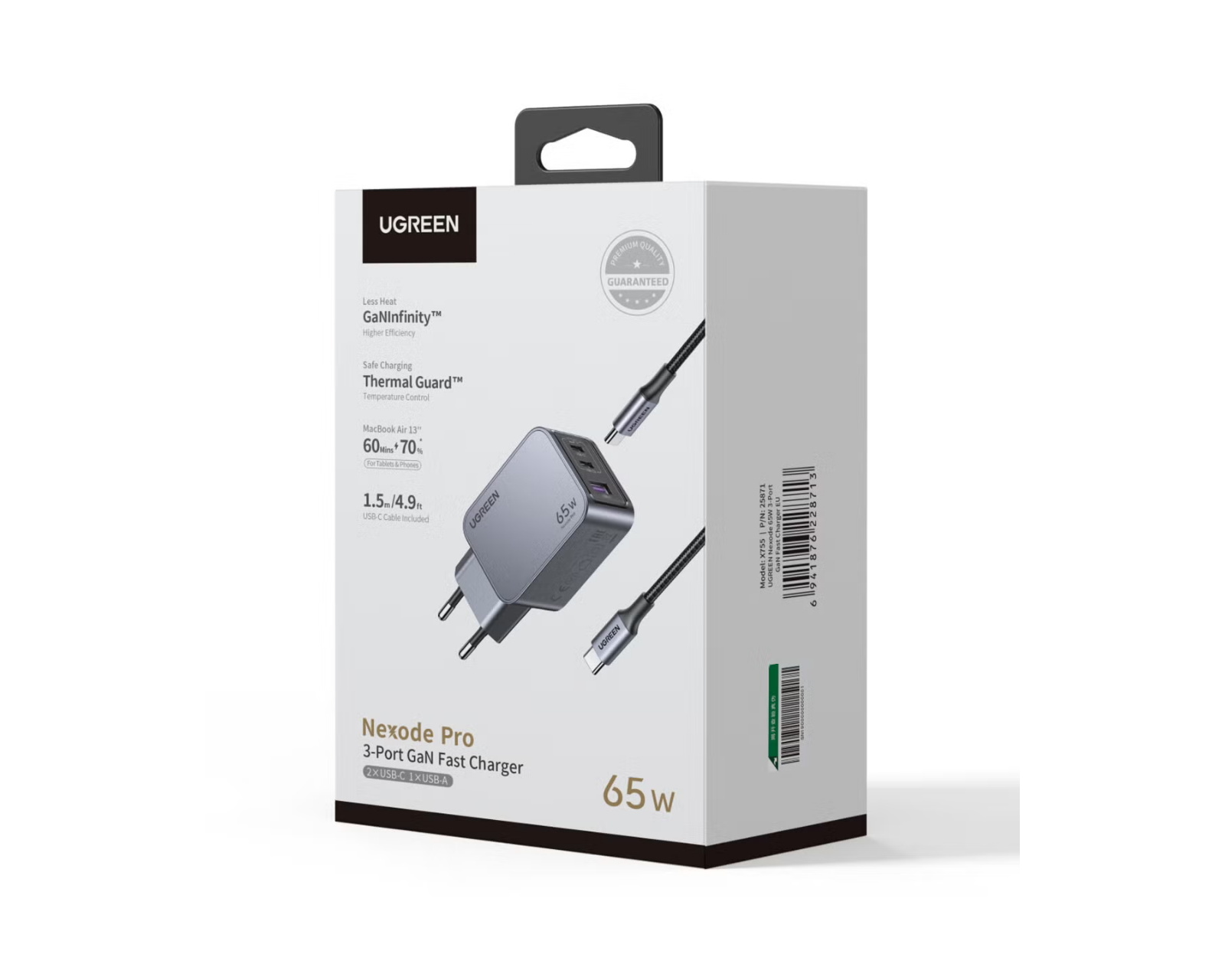 Nexode S 65W 3-port er en vegglader med hurtiglading av enheten din. Gjennom sin avanserte ladeteknologi kan du effektivt og pålitelig lade smarttelefonen, nettbrettet eller andre elektroniske enheter. Med sin smarte overopphetingsbeskyttelse kan du være sikker på at enhetene dine lades raskt og trygt. Sørg for at du alltid er klar for dagen med fulladede enheter som holder deg tilkoblet og produktiv hele dagen.Med Nexode S 65W har du tre tilgjengelige tilkoblingsporter, noe som gjør det enkelt for deg å holde alle enhetene dine fulladet og klare til bruk når du trenger dem. Disse portene gir deg muligheten til å lade smarttelefonen, nettbrettet og andre enheter samtidig, noe som er perfekt for å effektivt administrere din digitale hverdag.