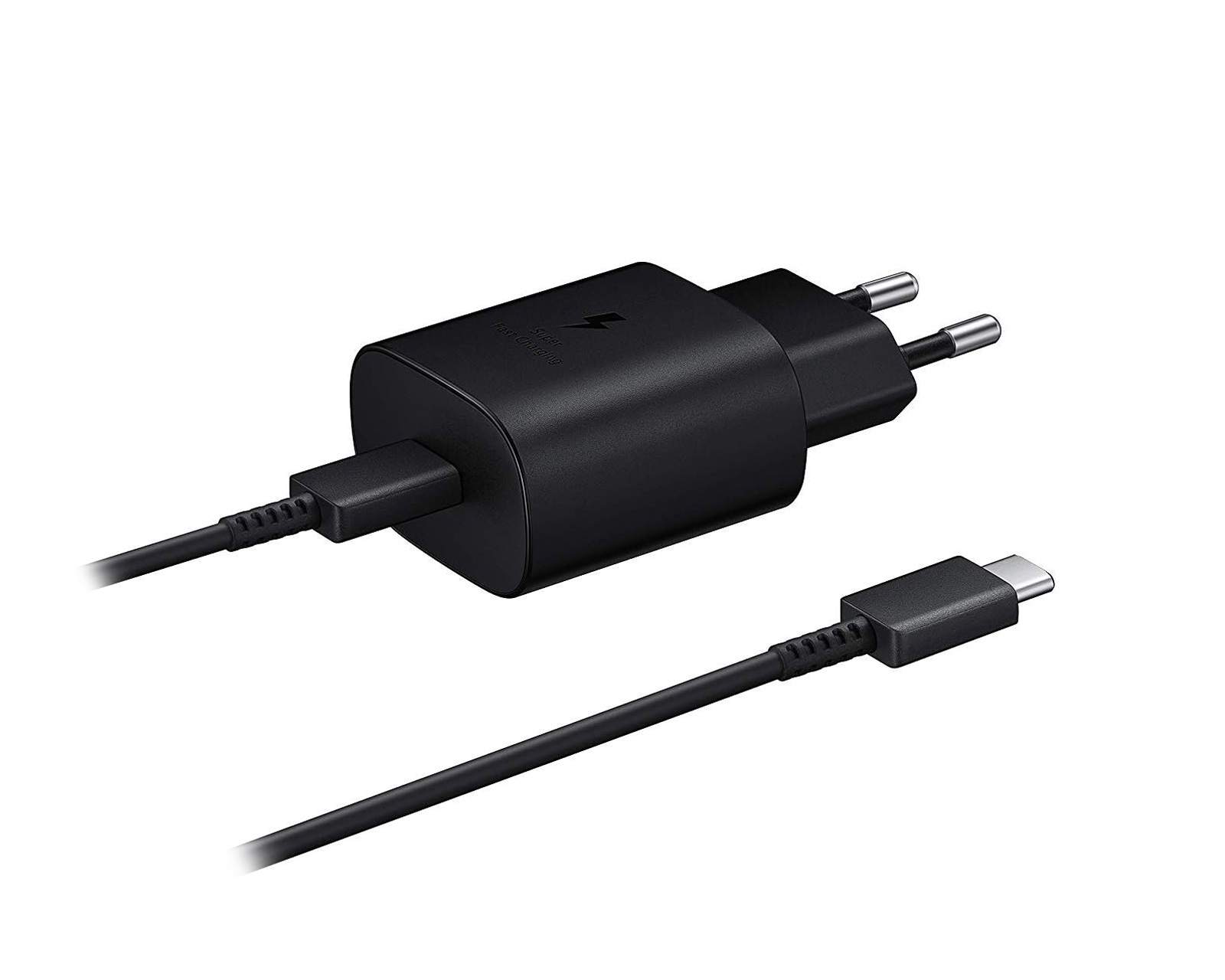 Samsung mobillader med USB-C utgang, maksimal effekt 25W og USB-C datakabel. Denne kraftige USB-C-laderen er designet for å lade enheten raskt uten å gå på kompromiss med sikkerheten.- Maks effekt 25W