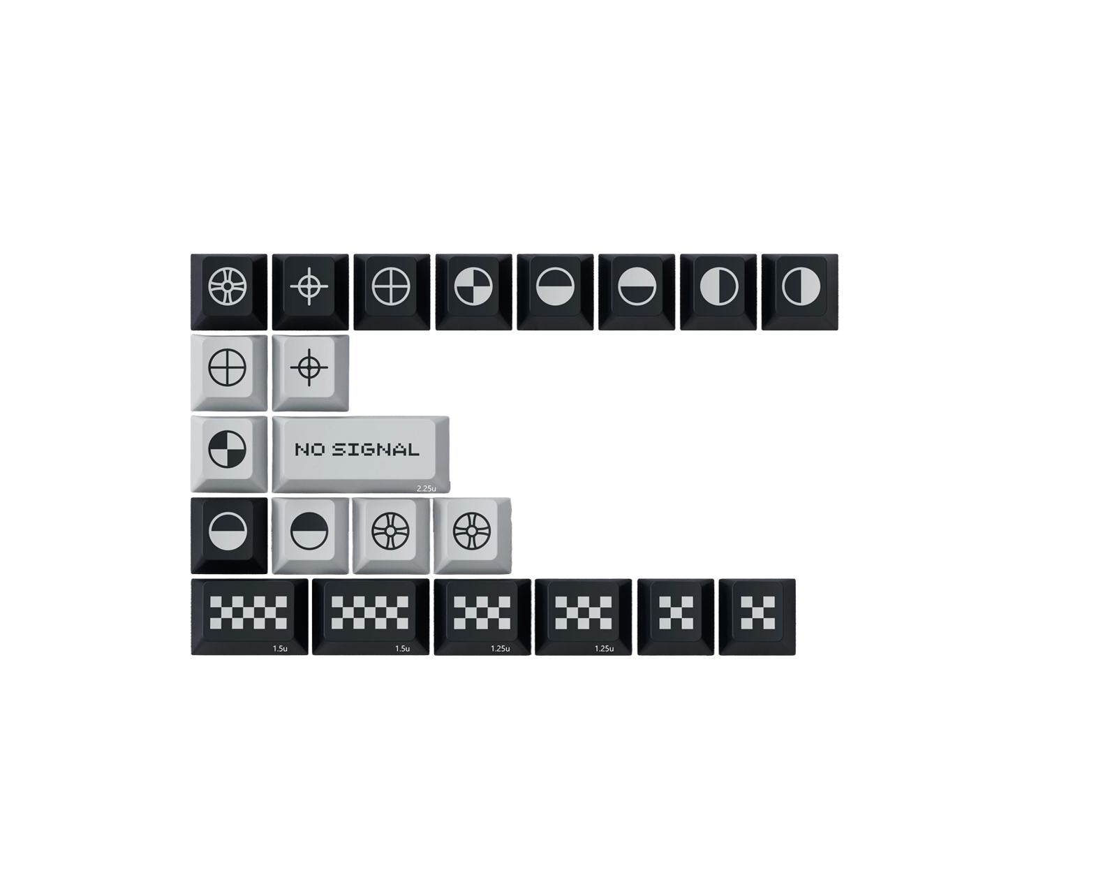 PBTfans No Signal er et noveltetssett fra KBDfans som er inspirert av elektronisk genererte testmønstre som historisk har blitt brukt for å kalibrere TV-apparater. Sett et inkluderer tastkapsler i PBT-materiale og er kompatibelt med Cherry MX-brytere samt MX-stilens kloner. Nøkkelelementene i designen refererer til ikoniske testmønstre som Indian-head testmønster og SMPTE-farger, noe som gir tastaturet en unik visuell estetikk med klare grafiske elementer. Vennligst merk at kun tastkapsler inngår; ingen tastatur følger med.PBT-materialet sikrer holdbarhet og motstandskraft mot slitasje, og Cherry-profilen tilbyr en velkjent smak for fingertuppene. Tastkapslene produseres med dye-sub og reverse dye-sub metoder, noe som sikrer at mønsteret radikalt forblir skarpt og varig over tid. Den leveres i en ABS tastkapselbrett med et designet brettlokk som gjør det enkelt å oppbevare og beskytte komponentene.