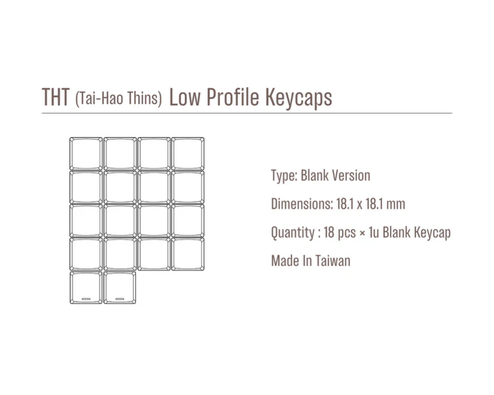 Lavprofil tastaturtaster er et sett med 18 blanke tastaturtaster fra Tai-Hao, laget av PBT-materiale. Sett inneholder 16 tastaturtaster samt 2 bonus-taster og er designet for bruk med Choc V1-brytere. Tastaturtastene har en THCS-profil, og målene er 16,5 × 17,5 mm. Det spesifikke PBT-materialet gir høy holdbarhet og slitasjemotstand, noe som er spesielt viktig for gamere som søker langvarig ytelse.Den lave profilen bidrar til en ergonomisk skriveopplevelse, mens de stille tastetrykkene minimerer lydnivået. Den minimalistiske designen uten merking gir en stilren estetikk som passer ulike oppsett-konfigurasjoner.