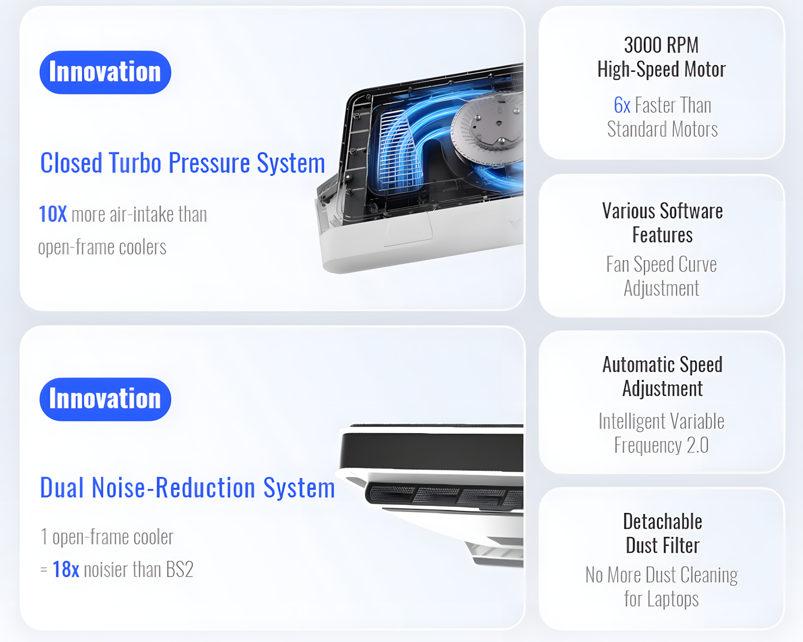 FLYDIGI BS2 Laptop Kjøler er en høyytelses kjøleplate fra Flydigi, designet for effektivt å senke temperaturen på bærbare datamaskiners CPU og GPU. Med en laboratorietestet temperaturreduksjon på opptil 36°C, forbedrer den både ytelse og stabilitet under krevende oppgaver som gaming og videoredigering. Kjøleplaten har et støynivå på maksimalt 53 dB, noe som gjør den stille enn de fleste innebygde vifter i datamaskiner.Bygget med et innovativt lukket turbo trykksystem, tilbyr BS2 et luftinntak som er 10 ganger mer effektivt enn åpne kjølesystemer. Den har en dual lydreduserende struktur som inkluderer et inntak for lyddemping og interne strømningsregulatorer for å eliminere uønskede høyfrekvente lyder. Kjøleplaten har en hastighet på 3000 RPM og tre forskjellige moduser; Stormmodus, Standardmodus og Stillemodus, som gir fleksibel kjøleytelse. Med den intelligente temperaturkontrollen 2.0 justeres viftens hastighet automatisk basert på bruken, noe som sikrer optimal kjøling, enten du spiller eller ser på video. Et støvsikker design med et avtakbart nett gjør det enkelt å holde enheten ren og i perfekt stand.