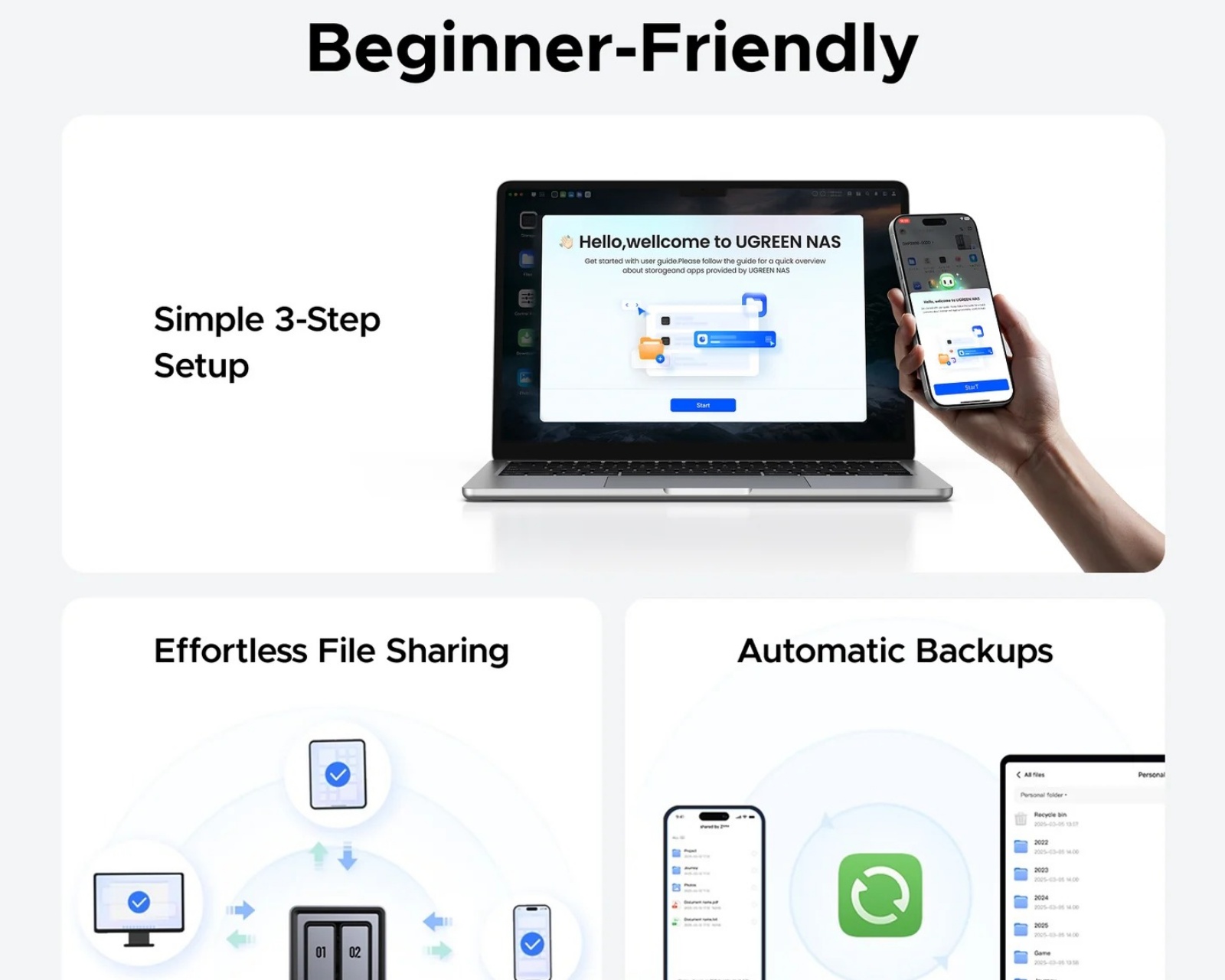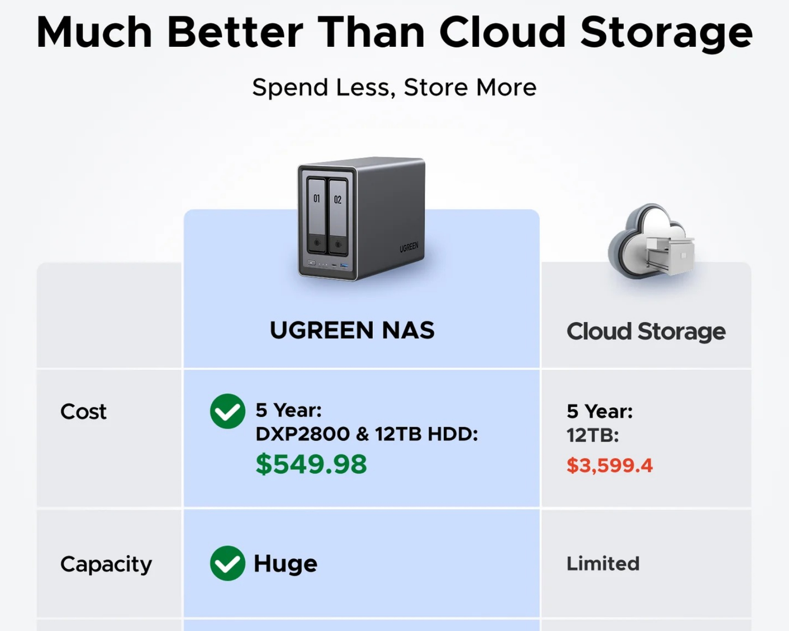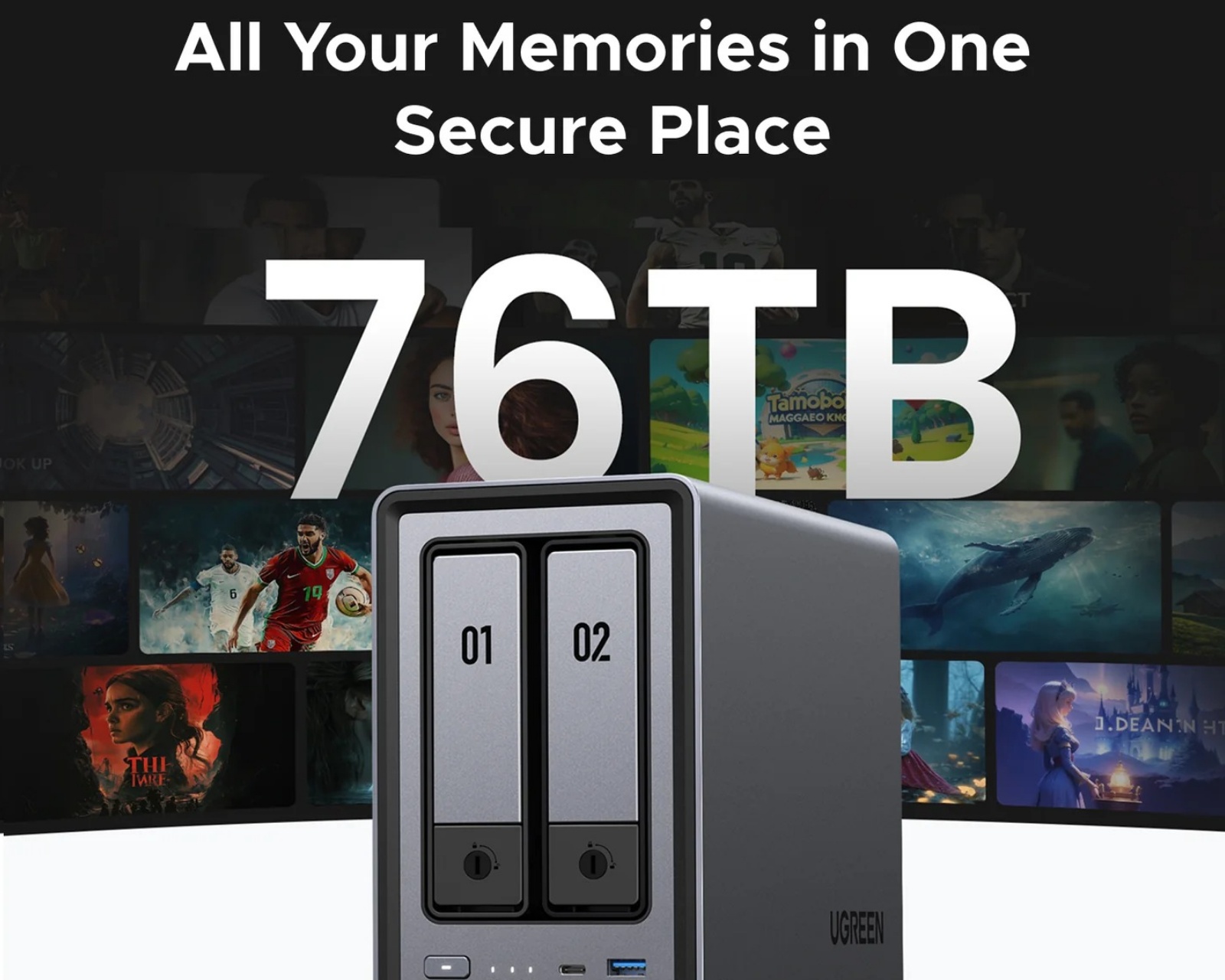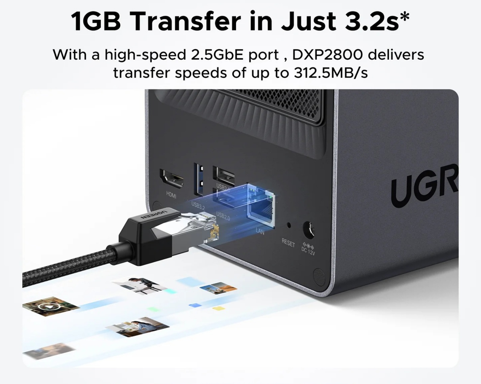 UGREEN NASync DXP2800 er en NAS (Network Attached Storage) fra UGREEN med to rom. Den er utstyrt med en Intel N100 firekjernet CPU, 8GB DDR5 RAM og en 2.5GbE LAN-port. Enheten tilbyr 76TB lagringskapasitet, noe som gjør den egnet for sikkerhetskopiering av data, automatiserte fotoalbum og hjemmeunderholdning. Den er designet for brukere som trenger en pålitelig lagringsløsning med enkel tilgang og deling over flere enheter.UGREEN NASync DXP2800 har en byggekvalitet som garanterer en lang levetid og stabil drift. Den støtter tredjeparts harddisker fra populære produsenter som Western Digital og Seagate. Gjennom sin AI-funksjon for bildebehandling kan den automatisk sortere bilder basert på ansikter, steder og objekter, samt fjerne duplikater. Tilkoblinger inkluderer 4K HDMI for videooverføring og en høy hastighet med 2.5GbE for nettverksforbindelse, noe som gjør filoverføringer smidige og raske. Enheten har også et effektivt kjølesystem som holder støynivåene lave.
