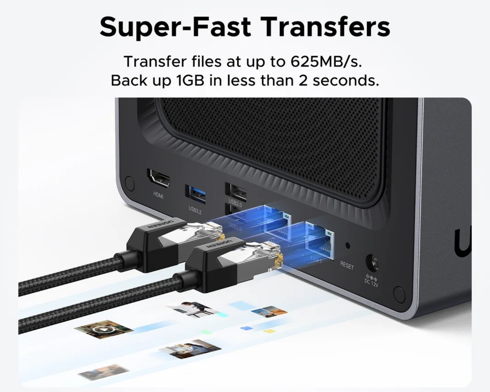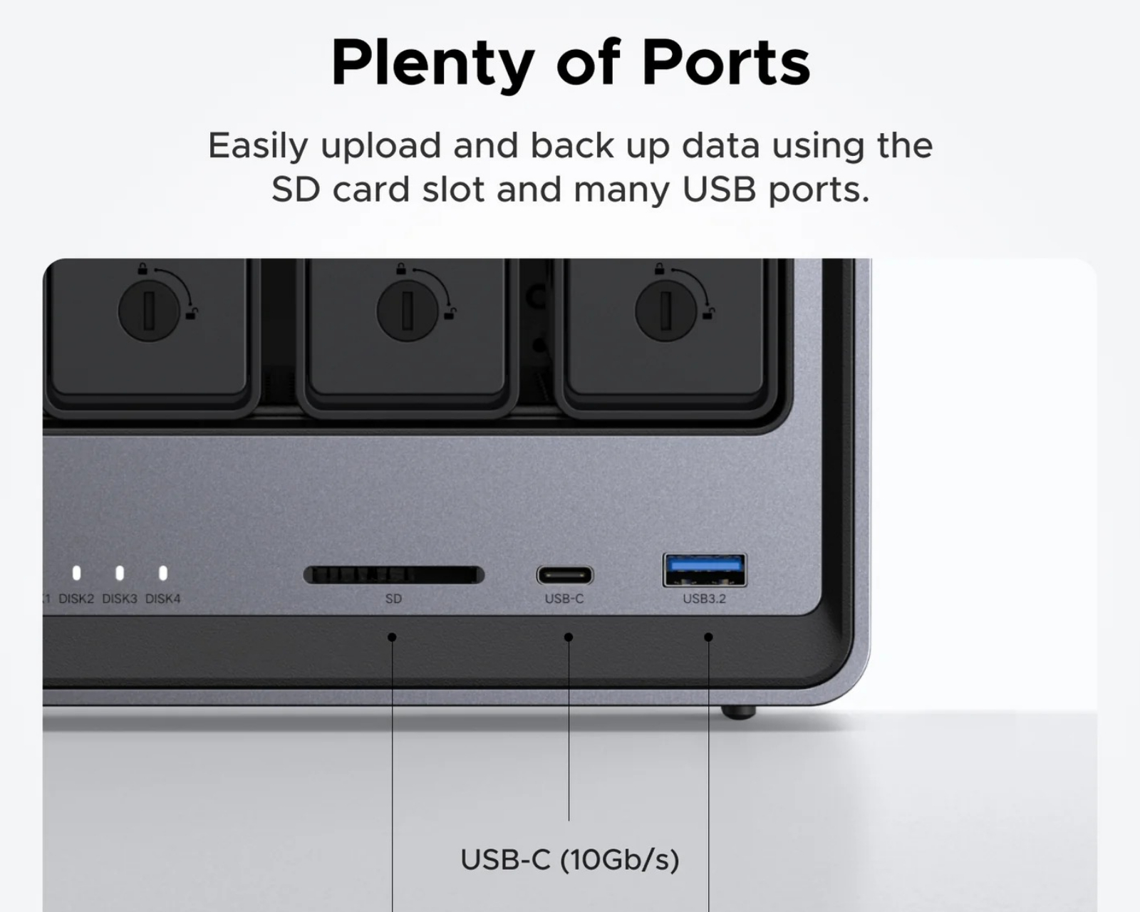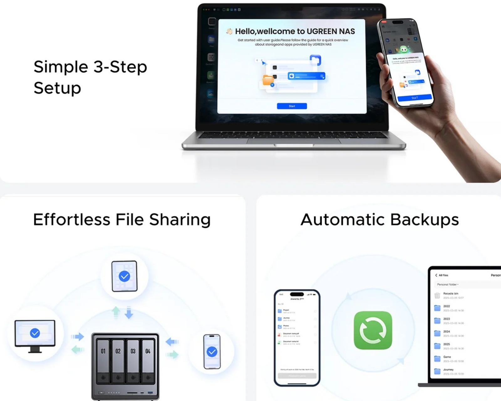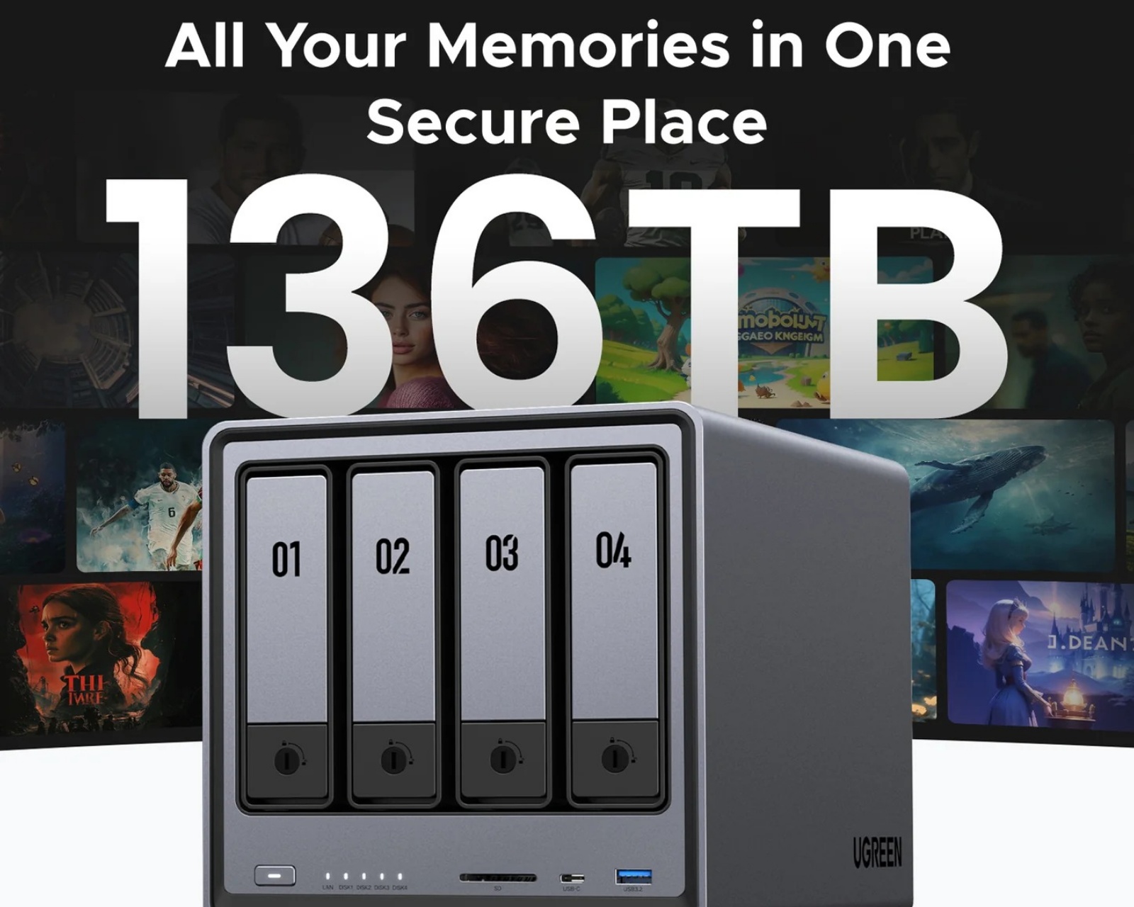 UGREEN NASync DXP4800 er en nettverkslagringsløsning fra UGREEN med fire plasser for harddisker og en Intel N100 quad-core CPU. Denne enheten har en RAM-kapasitet på 8GB DDR5 og tilbyr tilkoblinger via to 2.5GbE LAN-porter samt støtte for 4K via HDMI. DXP4800 retter seg mot brukere som søker en fleksibel lagringsløsning med høy kapasitet og rask dataadgang.Enheten har en maksimal lagringskapasitet på 136TB, noe som muliggjør lagring av opptil 47 millioner bilder eller 92 000 filmer. UGREEN NASync er kompatibel med en rekke tredjeparts harddisker og muliggjør sentralisert lagring, automatisk sikkerhetskopiering og fleksibel tilgang via en brukervennlig app. Den har også AI-funksjoner for bildebehandling og sikkerhetstiltak som beskytter brukerdata.
