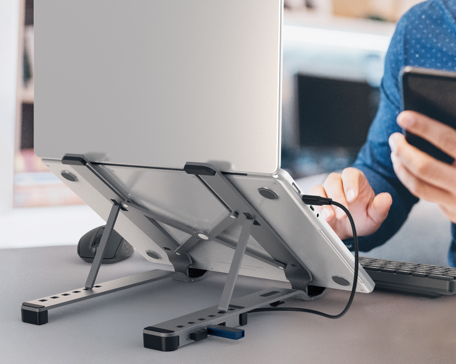 JTS223 er et bærbart stativ produsert av j5create og laget av slitesterk aluminium designet for bærbare datamaskiner og diverse andre gjenstander som nettbrett, bøker og lignende. Den sammenleggbare designen gjør det enkelt for deg å oppbevare og ta med hvor som helst. Perfekt alternativ for de som ønsker å fremme helse og ha en mer ergonomisk arbeidsstilling når du jobber og hvis du vil leke. Stativet hever enheten din slik at du slipper å se ned og ha dårlig nakke- og ryggstilling i lengre tid, det gjør det rett og slett lettere for deg å få bedre holdning på arbeidsplassen eller hjemme.Maksimal vekt er 10 kg og fungerer for de fleste bærbare datamaskiner som er opptil 16 tommer. Den integrerte USB-C minihubben har fire USB 5 Gbps Type-A-porter, som gir tilkoblingen du trenger for økt produktivitet og for å koble til eksterne enheter.