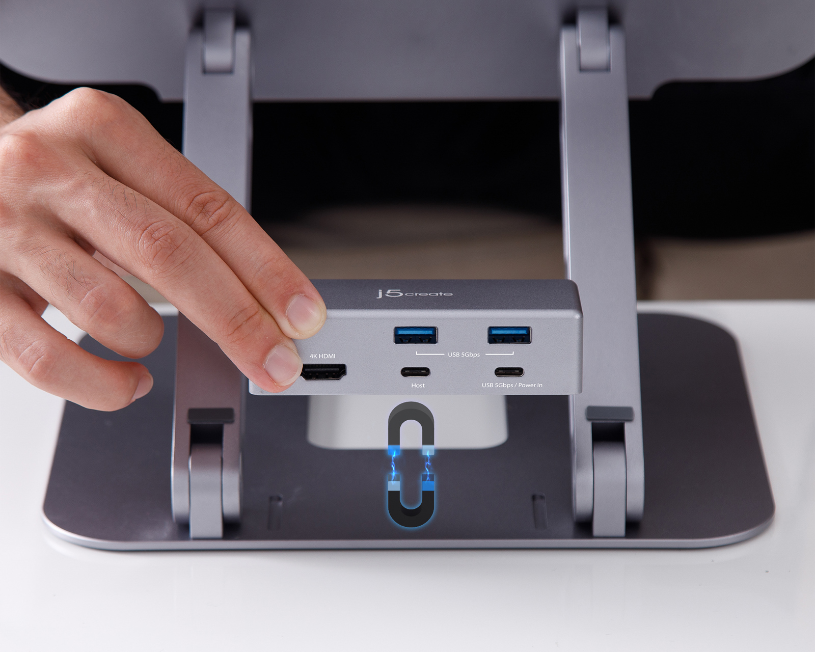 JTS327 er et justerbart stativ for bærbar PC fra j5create, med aluminiumskropp, anti-skli silikonpute og beskyttende krok får du et førsteklasses laptopstativ. I tillegg til den bærbare datamaskinen, kan du også plassere andre enheter og ting på den som nettbrett og bøker. Perfekt alternativ for de som ønsker å fremme helse og ha en mer ergonomisk arbeidsstilling når du jobber og hvis du vil leke. Stativet hever enheten din slik at du slipper å se ned og ha dårlig nakke- og ryggstilling over en lengre periode, det gjør det rett og slett lettere for deg å få bedre holdning på arbeidsplassen eller hjemme. Den har en maksimal vekt på 4 kg og fungerer for bærbare datamaskiner som er 16" og mindre.Den integrerte USB-C minidokkingstasjonen har 4K HMDI-utgang, to USB 5Gbps Type-A-porter og også en USB-C-port som støtter 5Gbps dataoverføringshastighet og har en strømforsyning på 100 W. JTS327 har alle tilkoblingsmulighetene du trenger for enkelt og greit å bygge opp arbeidsplassen hjemme og koble til datamaskintilbehøret for økt produktivitet og forbedret spillopplevelse.